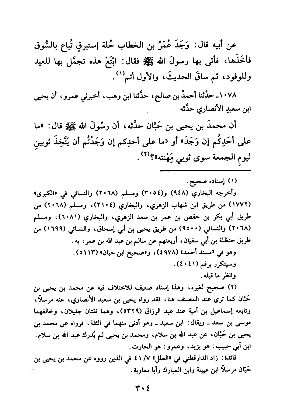 عن أبيه قال: وَجَدَ عُمَرُ بن الخطاب حُلة إستبرقٍ تُباع بالسُوق فأخَذَها، فأتى بها رسولَ الله- صلَّى الله عليه وسلم -فقال: ابْتَع هذه تجمَّل بها للعيد وللوفود، ثم ساقَ الحديثَ، والأول أتم (¬١).