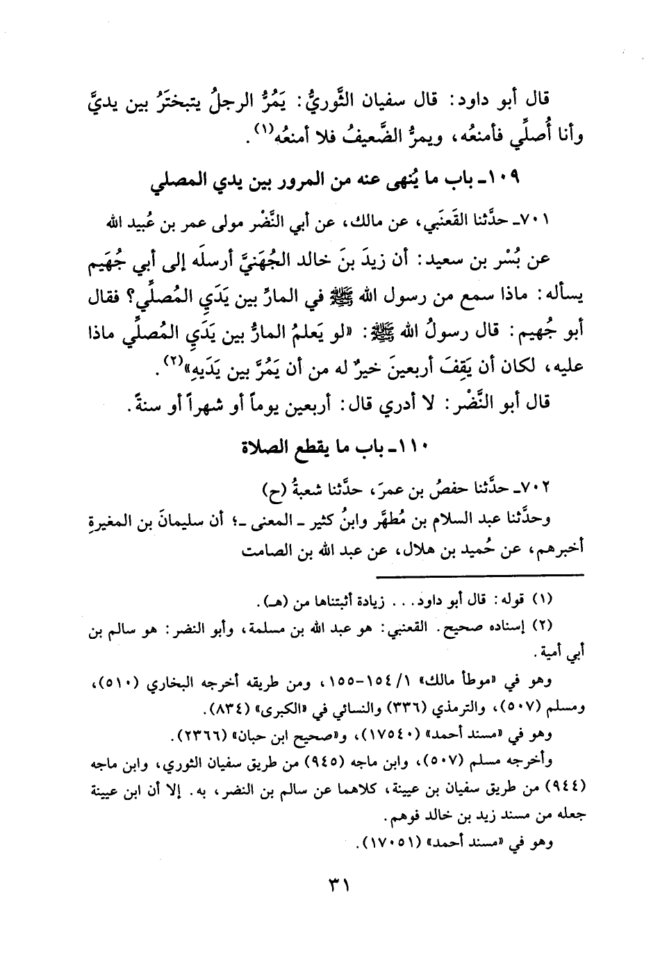 ٧٠١ - حدَثنا القَعنَبي، عن مالك، عن أبي النَّضْر مولى عمر بن عُبيد الله عن بُسْر بن سعيد: أن زيدَ بنَ خالد الجُهَنى أرسلَه إلى أبي جُهَيم يسأله: ماذا سمع من رسول الله- صلى الله عليه وسلم -في المارّ بين يَدَيِ المُصلي؟ فقال أبو جُهيم: قال رسولُ الله- صلى الله عليه وسلم -: "لو يَعلمُ المارُ بين يَدَيِ المُصلي ماذا عليه، لكان أن يَقِفَ أربعينَ خيرٌ له من أن يَمُر بين يَدَيهِ" (¬٢).