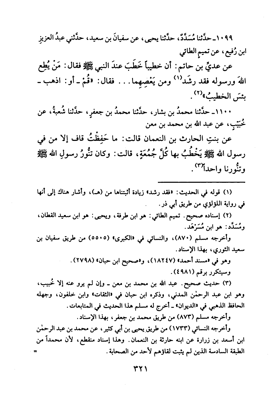 ١٠٩٩ - حدثنا مُسَدد، حدثنا يحيى، عن سفيانَ بن سعيد، حدثني عبدُ العزيزِ ابن رُفيع، عن تميمٍ الطائي
