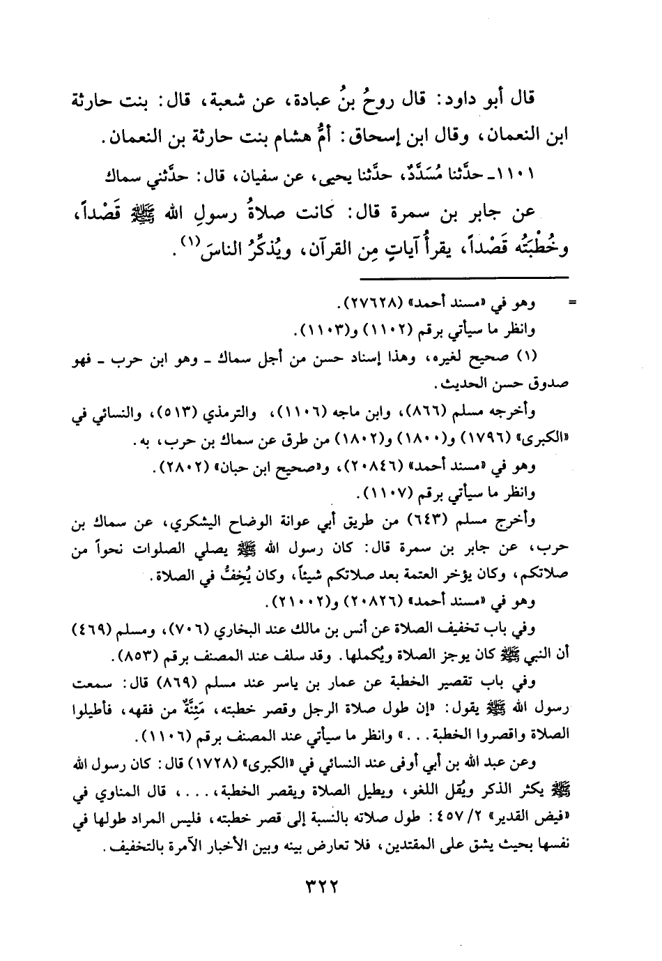 ١١٠١ - حدَّثنا مُسَدَّدٌ، حدثنا يحيى، عن سفيان، قال: حدّثني سماك عن جابر بن سمرة قال: كانت صلاةُ رسولِ الله - صلَّى الله عليه وسلم - قصْداً، وخُطْبَتُه قَصْداً، يقرأُ آياتٍ مِن القرآن، ويُذكرُ الناسَ (¬١).
