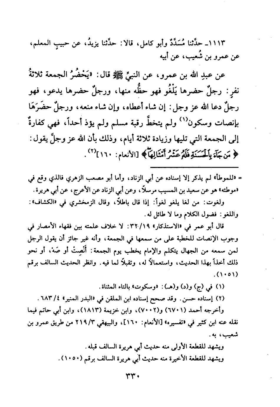 عن عبدِ الله بن عمرو، عن النبي - صلَّى الله عليه وسلم - قال: "يَحضُرُ الجمعة ثلاثةُ نفرِ: رجلٌ حضرها يَلْغُو فهو حظه منها، ورجلٌ حضرها يدعو، فهو رجلٌ دعا الله عز وجل: إن شاء أعطاه، وإن شاء منعه، ورجلٌ حضَرَهَا بإنصات وسكون (¬١) ولم يتخط رقبة مسلم ولم يؤذ أحداً، فهي كفارةٌ إلى الجمعة التي تليها وزيادة ثلاثة أيام، وذلك بأن الله عز وجل يقول: {مَنْ جَاءَ بِالْحَسَنَةِ فَلَهُ عَشْرُ أَمْثَالِهَا} [الأنعام: ١٦٠] (¬٢).