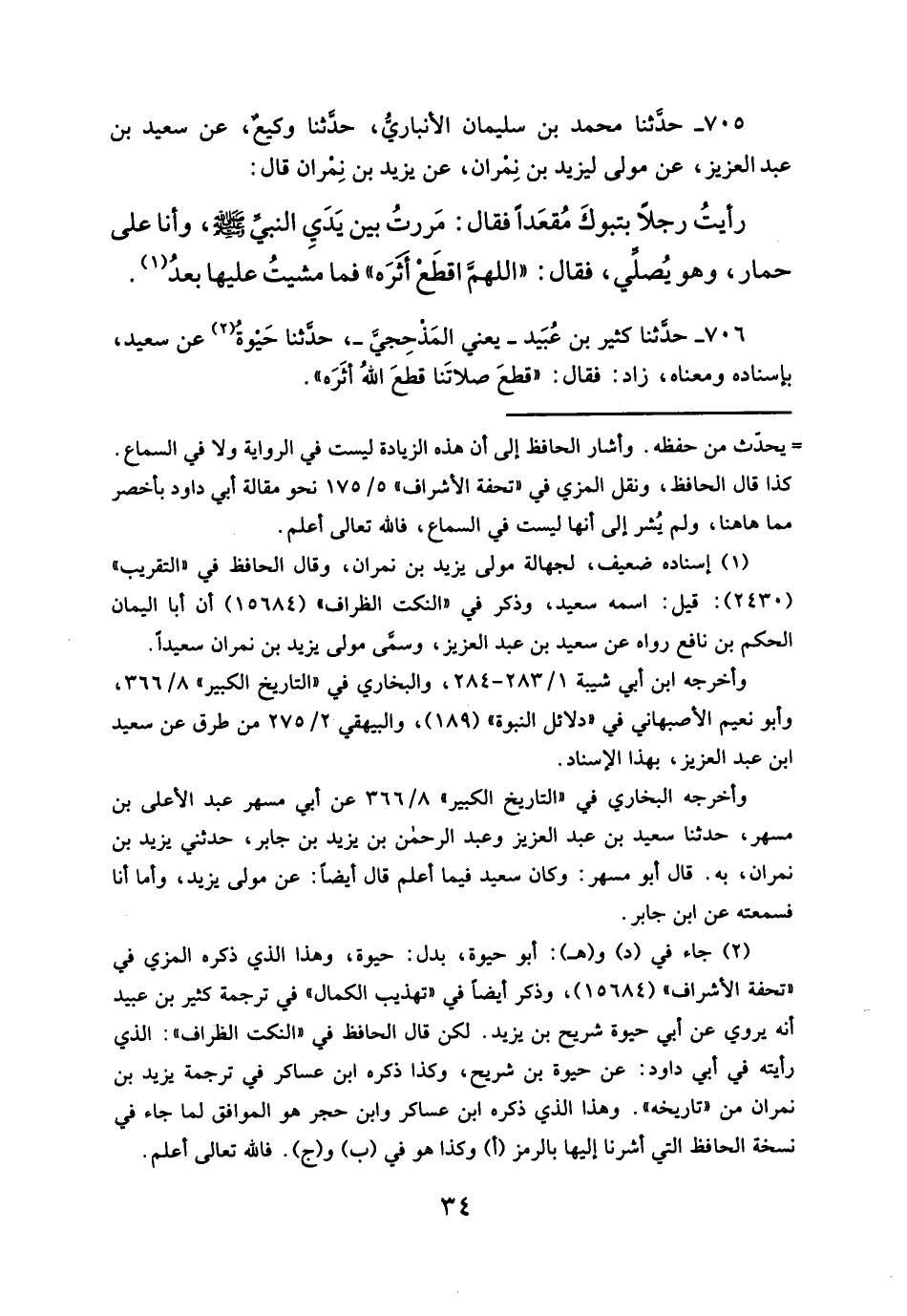 (¬٢) جاء في (د) و (هـ): أبو حيوة، بدل: حيوة، وهذا الذي ذكره المزي في "تحفة الأشراف" (١٥٦٨٤)، وذكر أيضاً في "تهذيب الكمال" في ترجمة كثير بن عبيد أنه يروي عن أبي حيوة شريح بن يزيد. لكن قال الحافظ في "النكت الظراف": الذي رأيته في أبي داود: عن حيوة بن شريح، وكذا ذكره ابن عساكر في ترجمة يزيد بن نمران من "تاريخه". وهذا الذي ذكره ابن عساكر وابن حجر هو الموافق لما جاء في نسخة الحافظ التي أشرنا إليها بالرمز (أ) وكذا هو في (ب) و (ج). فالله تعالى أعلم.