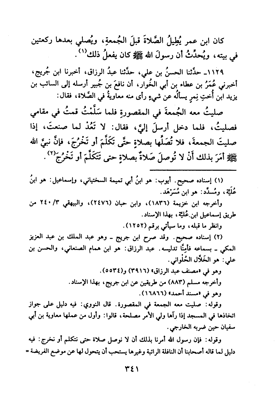 ١١٢٩ - حدثنا الحسنُ بن علي، حدثنا عبدُ الرزاق، أخبرنا ابن جُريج، أخبرني عُمَرُ بن عطاء بن أبي الخُوار، أن نافعَ بن جُبير أرسله إلى السائب بن يزيد ابن أُختِ نِمرِ يسألُه عن شيءٍ رأى منه معاويةُ في الصلاة، فقال: