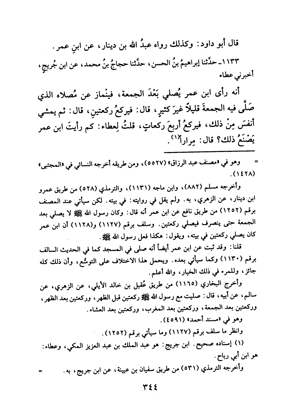 أنه رأى ابن عمر يُصلي بَعْدَ الجمعة، فينْماز عن مُصلاه الذي صَلَّى فيه الجمعةَ قليلاً غيرَ كثيرِ، قال: فيركعُ ركعتينِ، قال: ثم يمشي أنفسَ مِن ذلك، فيركعُ أربعَ ركعاتٍ، قلتُ لِعطاء: كم رأيتَ ابن عمر يَضنَعُ ذلك؟ قال: مِراراً (¬١).