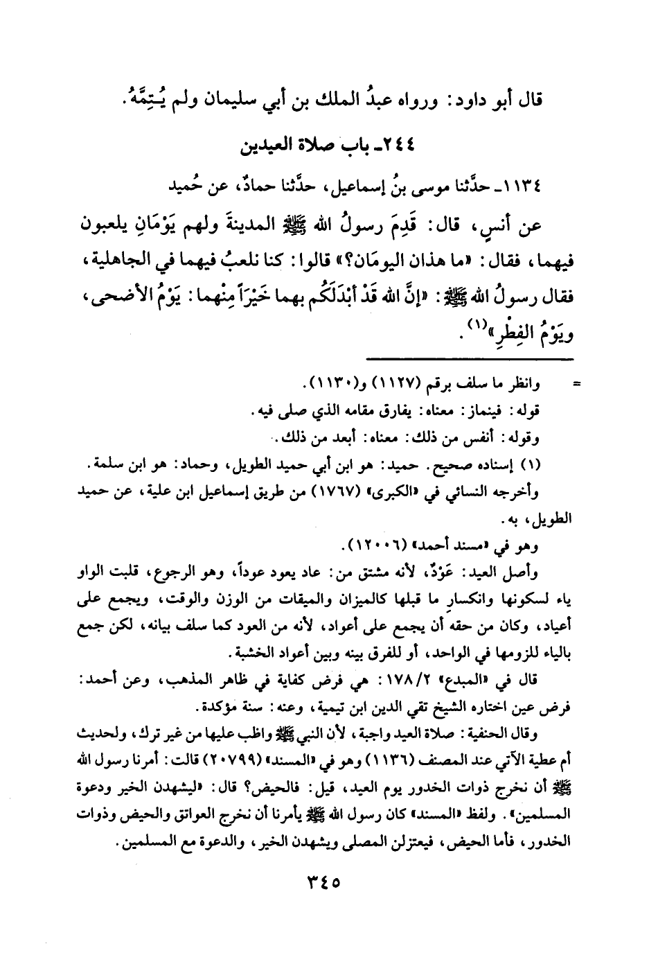 عن أنسِ، قال: قَدِمَ رسولُ الله - صلَّى الله عليه وسلم - المدينةَ ولهم يَوْمَانِ يلعبون فيهما، فقال: "ما هذان اليومَان؟ " قالوا: كنا نلعبُ فيهما في الجاهلية، فقال رسولُ الله - صلَّى الله عليه وسلم -: "إنَّ الله قَدْ أبدَلَكُم بهما خَيرَاً مِنهما: يَومُ الأضحى، ويَومُ الفِطرِ" (¬١).