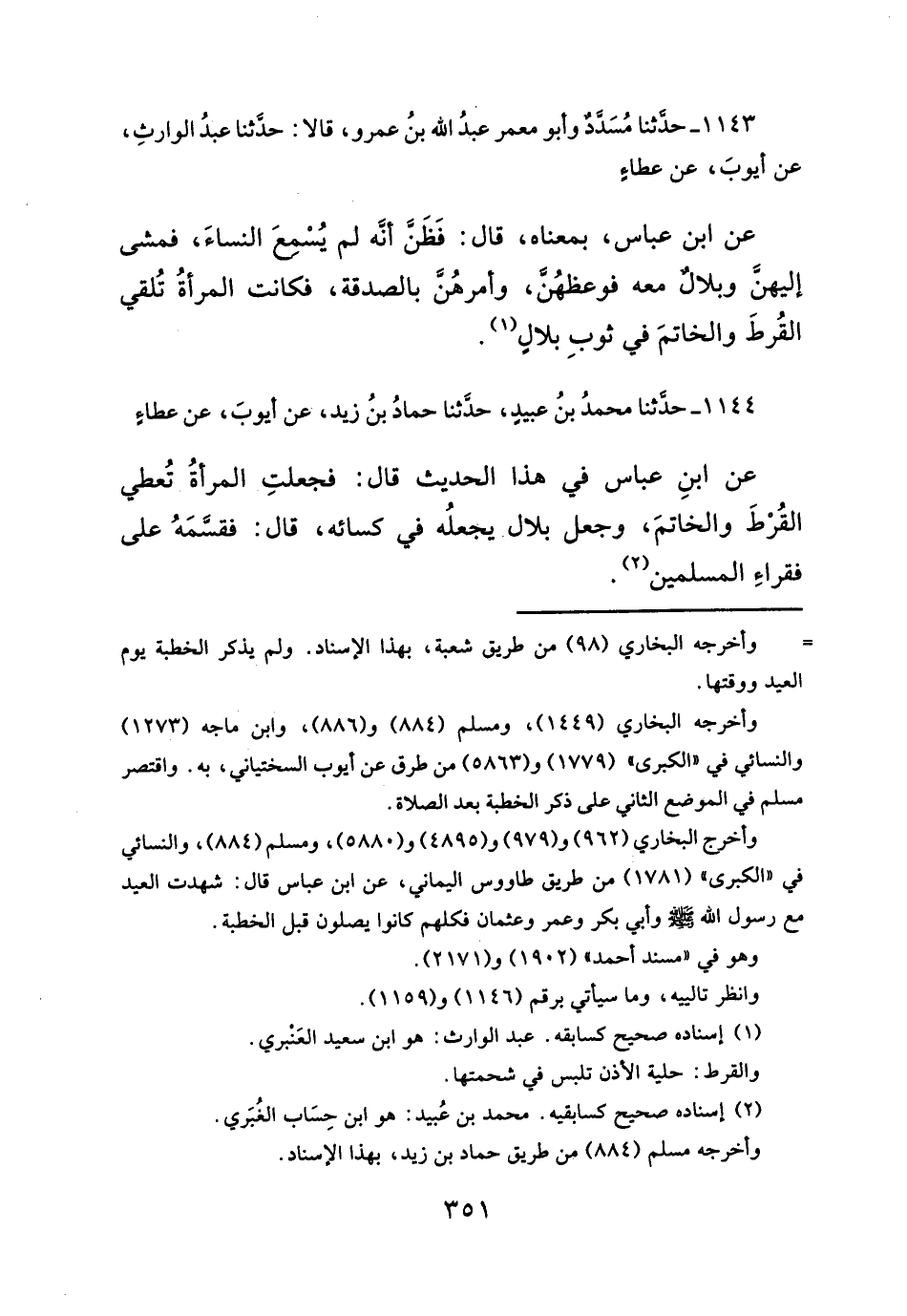 ١١٤٤ - حدثنا محمدُ بنُ عبيدٍ، حدثنا حمادُ بنُ زيد، عن أيوبَ، عن عطاءٍ عن ابنِ عباس في هذا الحديث قال: فجعلتِ المرأةُ تُعطي القُرْطَ والخاتمَ، وجعل بلال يجعلُه في كسائه، قال: فقسَّمَهُ على فقراءِ المسلمين (¬٢).
