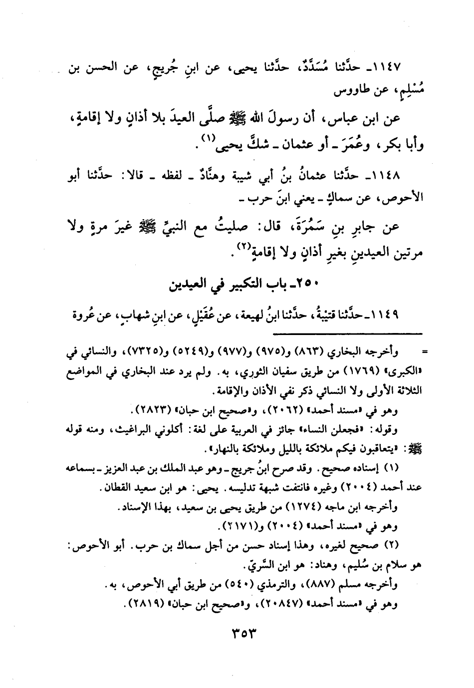 عن ابن عباس، أن رسولَ الله - صلَّى الله عليه وسلم - صلَّى العيدَ بلا أذانٍ ولا إقامةٍ، وأبا بكر، وعُمَرَ - أو عثمان - شكَّ يحيى (¬١).