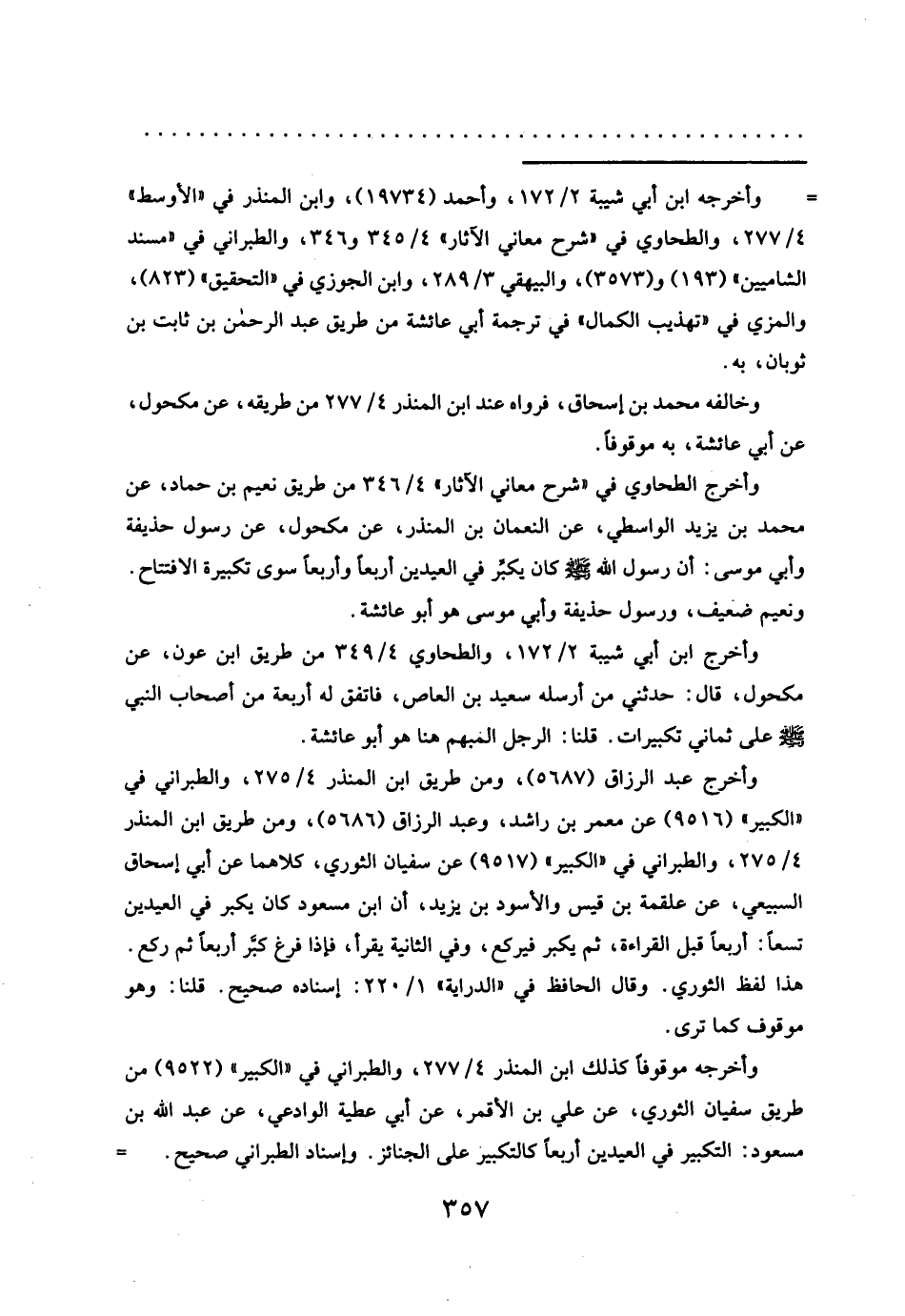 وأخرج عبد الرزاق (٥٦٨٧)، ومن طريق ابن المنذر ٤/ ٢٧٥، والطبراني في "الكبير" (٩٥١٦) عن معمر بن راشد، وعبد الرزاق (٥٦٨٦)، ومن طريق ابن المنذر ٤/ ٢٧٥، والطبرانى في "الكبير" (٩٥١٧) عن سفيان الثوري، كلاهما عن أبي إسحاق السبيعي، عن علقمة بن قيس والأسود بن يزيد، أن ابن مسعود كان يكبر في العيدين تسعاً: أربعاً قبل القراءة، ثم يكبر فيركع، وفي الثانية يقرأ، فإذا فرغ كبر أربعاً ثم ركع. هذا لفظ الثوري، وقال الحافظ في "الدراية" ١/ ٢٢٠: إسناده صحيح. قلنا: وهو موقوف كما ترى.