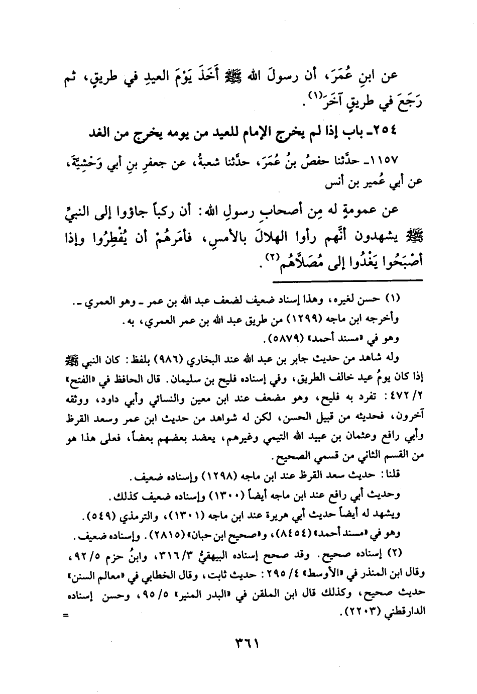 عن ابنِ عُمَرَ، أن رسولَ الله - صلَّى الله عليه وسلم - أَخَذَ يَوْمَ العيدِ في طريقٍ، ثم رَجَعَ في طريقٍ آخَرَ (¬١).
