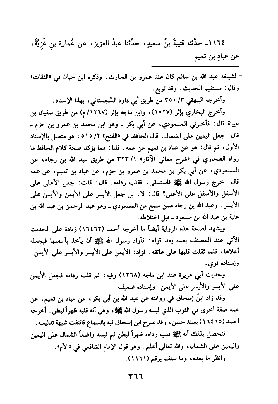 قال: خرج رسول الله - صلَّى الله عليه وسلم - فاستسقى، فقلب رداءه. قال: قلت: جعل الأعلى على الأسفل والأسفل على الأعلى؟ قال: لا، بل جعل الأيسر على الأيمن والأيمن على الأيسر. وعبد الله بن رجاء ممن سمع من المسعودي - وهو عبد الرحمن بن عبد الله بن عتبة بن عبد الله بن مسعود - قبل اختلاطه.