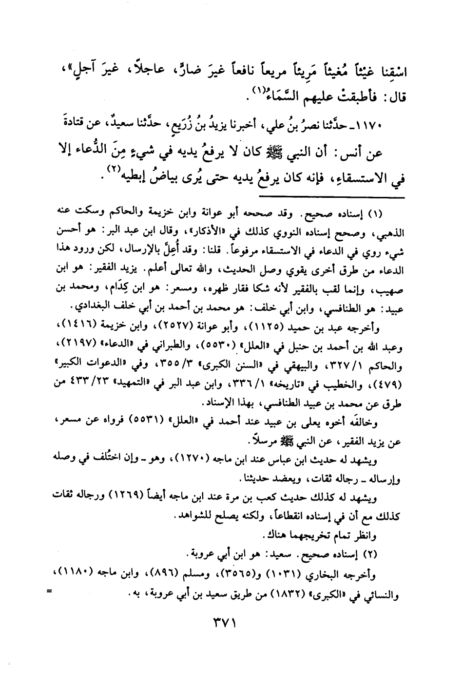 (¬١) إسناده صحيح. وقد صححه أبو عوانة وابن خزيمة والحاكم وسكت عنه الذهبي، وصحح إسناده النووي كذلك في"الأذكار"، وقال ابن عبد البر: هو أحسن شيء روي في الدعاء في الاستسقاء مرفوعاً. قلنا: وقد أُعِلَّ بالإرسال، لكن ورود هذا الدعاء من طرق أخرى يقوي وصل الحديث، والله تعالى أعلم. يزيد الفقير: هو ابن صهيب، وإنما لقب بالفقير لأنه شكا فقار ظهره، ومسعر: هو ابن كِدَام، ومحمد بن عبيد: هو الطنافسي، وابن أبي خلف: هو محمد بن أحمد بن أبي خلف البغدادي.