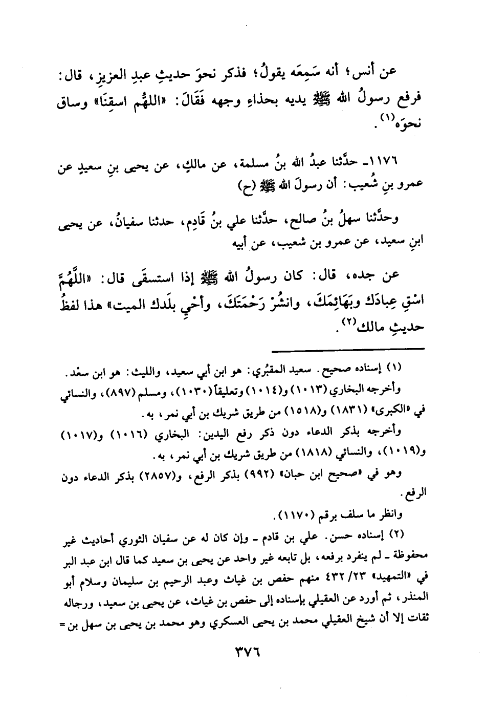 ١١٧٦ - حدثنا عبدُ الله بنُ مسلمة، عن مالك، عن يحيي بنِ سعيدٍ عن عمرو بنِ شُعيب: أن رسولَ الله - صلَّى الله عليه وسلم - (ح)