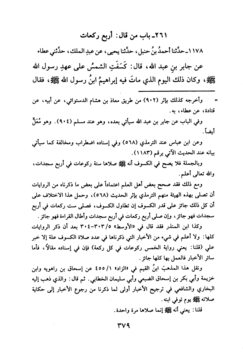 ١١٧٨ - حدثنا أحمدُ بنُ حنبل، حدَّثنا يحيي، عن عبدِ الملك، حدَّثني عطاء عن جابر بنِ عبد الله، قال: كَسَفَتِ الشمسُ على عهدِ رسول الله - صلَّى الله عليه وسلم -، وكان ذلك اليوم الذي ماتَ فيه إبراهيمُ ابنُ رسول الله - صلَّى الله عليه وسلم -، فقال