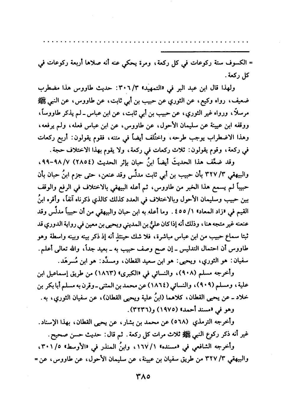 وقد ضعَّف هذا الحديثَ أيضاً ابنُ حبان بإثر الحديث (٢٨٥٤) ٧/ ٩٨ - ٩٩، والبيهقي ٣/ ٣٢٧ بأن حبيب بن أبي ثابت مدلس وقد عنعن، حتى جزم ابنُ حبان بأن حبيباً لم يسمع هذا الخبر من طاووس، ثم أعله البيهقي بالاختلاف في الرفع والوقف بين حبيب وسليمان الأحول وبالاختلاف في العدد كذلك كالذي ذكرناه آنفاً، وأقره ابنُ القيم في "زاد المعاد" ١/ ٤٥٥. وما أعله. به ابن حبان والبيهقي من أن حبيباً مدلس وقد عنعنه غير متجه هنا، وذلك أنه إذا كان علي بن المديني ويحيى بن معين في رواية الدوري قد ثبتا سماع حبيب من ابن عباس مباشرة، فلا شك حينئذ أنه إذ ذكر بينه وبينه واسطة وهو طاووس أن احتمال التدليس - إن صح وصف حبيب به - بعيد جداً، والله تعالى أعلم.