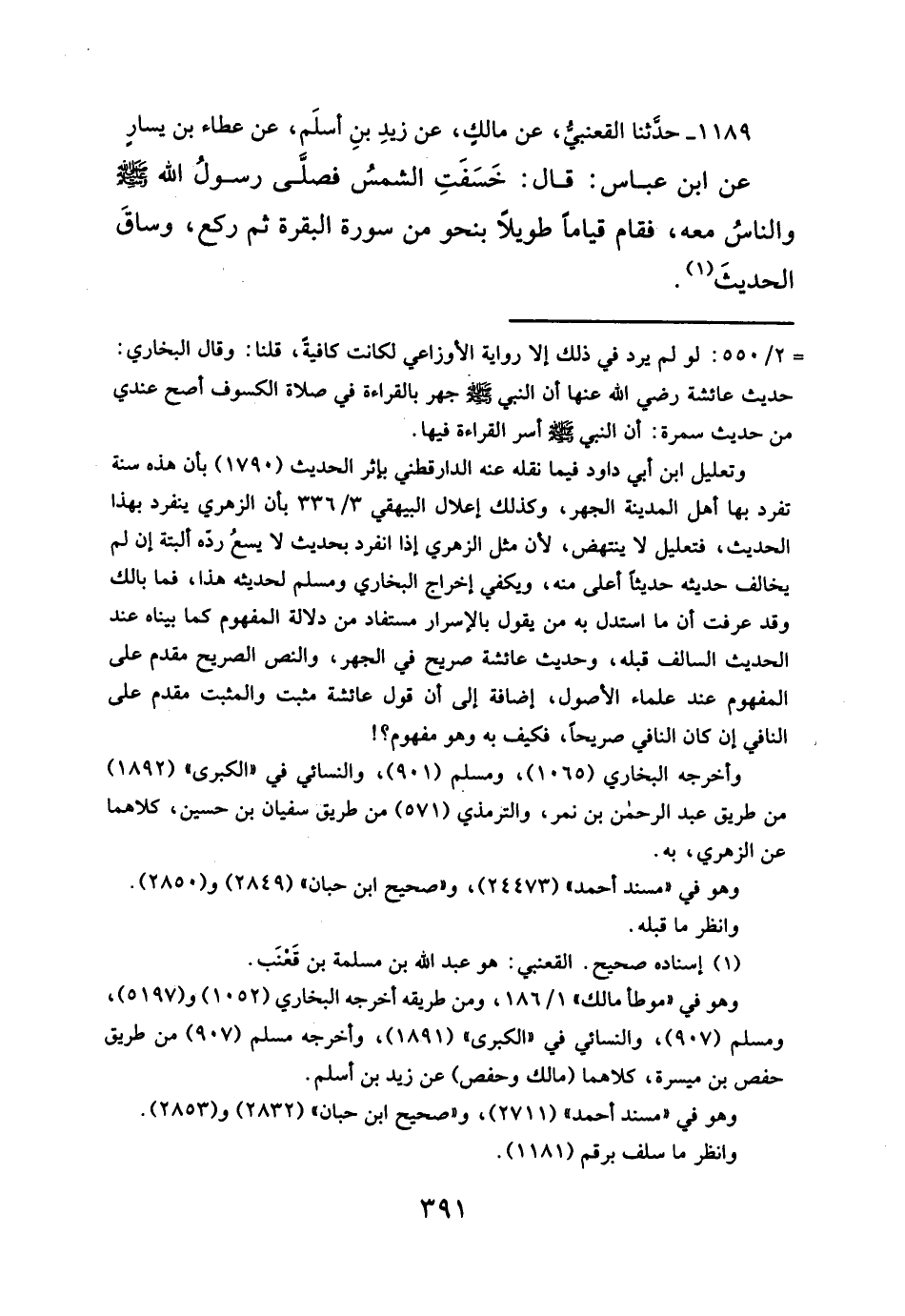 ١١٨٩ - حدثنا القعنبي، عن مالك، عن زيدِ بنِ أسلَم، عن عطاء بن يسارِ عن ابن عباس: قال: خَسَفَتِ الشمسُ فصلَّى رسولُ الله - صلَّى الله عليه وسلم - والناسُ معه، فقام قياماً طويلاً بنحو من سورة البقرة ثم ركع، وساقَ الحديثَ (¬١).