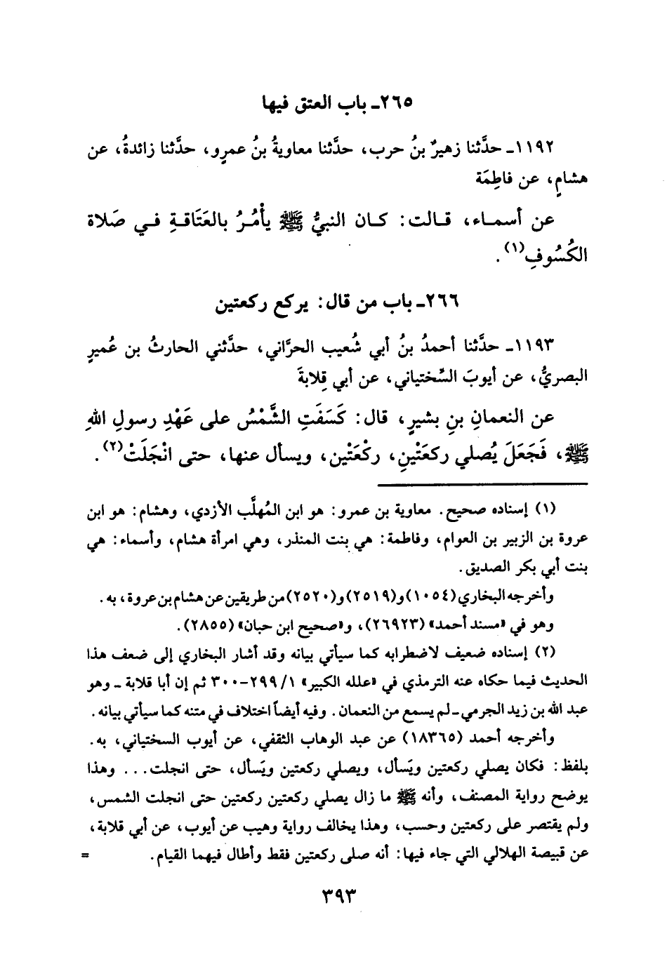 عن النعمانِ بنِ بشيرٍ، قال: كسَفَتِ الشمسُ على عَهْدِ رسولِ اللهِ - صلَّى الله عليه وسلم -، فَجَعَلَ يُصلي ركعَتْينِ، ركعَتين، ويسأل عنها، حتى انجَلَت (¬٢).