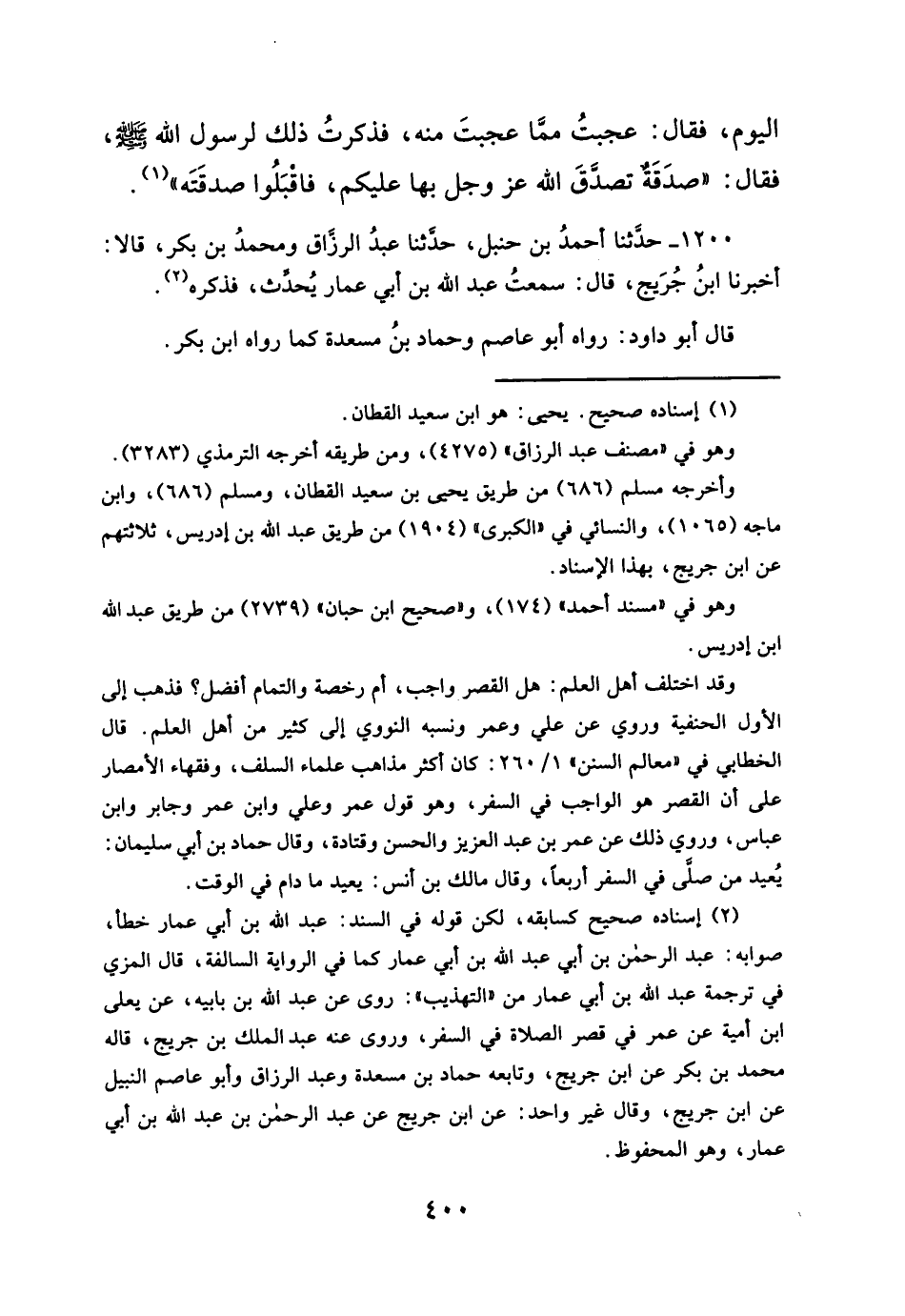 ١٢٠٠ - حدثنا أحمدُ بن حنبل، حدثنا عبدُ الرزاق ومحمدُ بن بكر، قالا: أخبرنا ابنُ جُرَيج، قال: سمعتُ عبد الله بن أبي عمار يُحدّث، فذكره (¬٢).