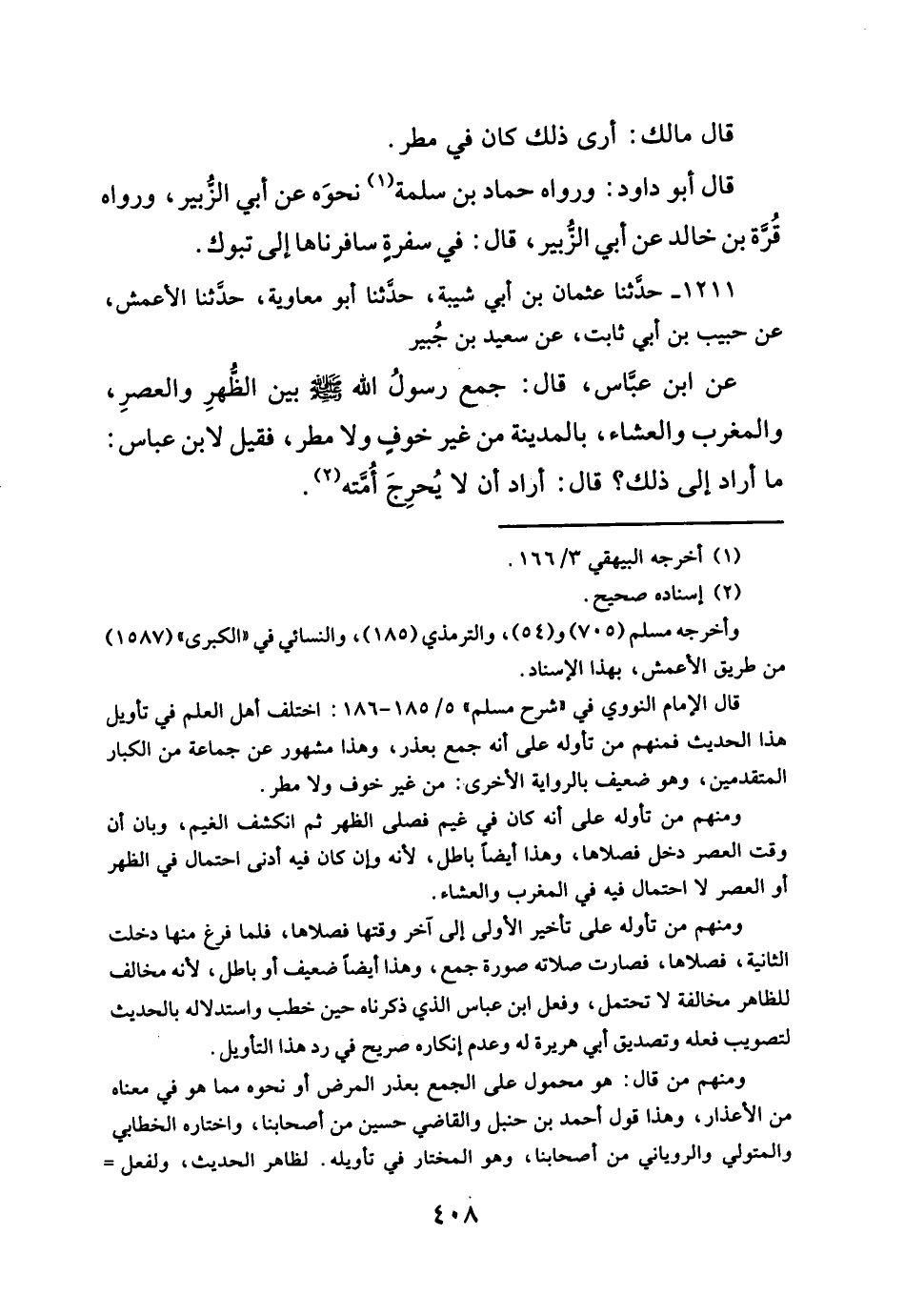 قال الإمام النووي في "شرح مسلم" ٥/ ١٨٥ - ١٨٦: اختلف أهل العلم في تأويل هذا الحديث فمنهم من تأوله على أنه جمع بعذر، وهذا مشهور عن جماعة من الكبار المتقدمين، وهو ضعيف بالرواية الأخرى: من غير خوف ولا مطر.