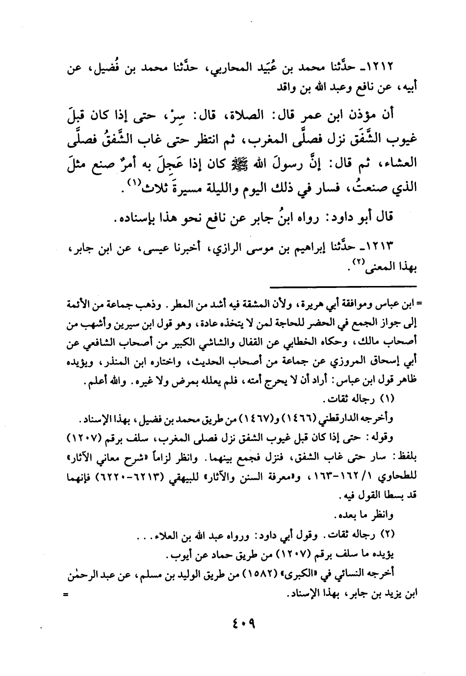 أن مؤذن ابن عمر قال: الصلاة، قال: سِرْ، حتى إذا كان قبلَ غيوب الشَفَق نزل فصلَّى المغرب، ثم انتظر حتى غاب الشَّفقُ فصلَّى العشاء، ثم قال: إنَّ رسولَ الله - صلَّى الله عليه وسلم - كان اذا عَجِلَ به أمر صنع مثلَ الذي صنعتُ، فسار في ذلك اليوم والليلة مسيرةَ ثلاث (¬١).