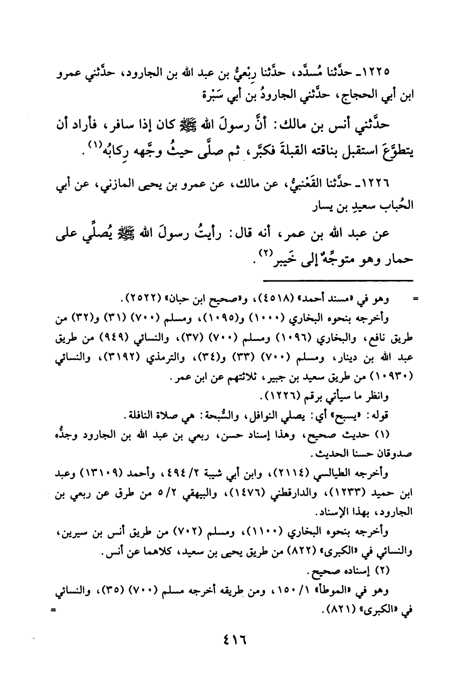 حدَّثني أنس بن مالك: أن رسولَ الله - صلَّى الله عليه وسلم - كان إذا سافر، فأراد أن يتطوَّعَ استقبل بناقته القبلةَ فكبَّر، ثم صلَّى حيثُ وجهه رِكابُه (¬١).