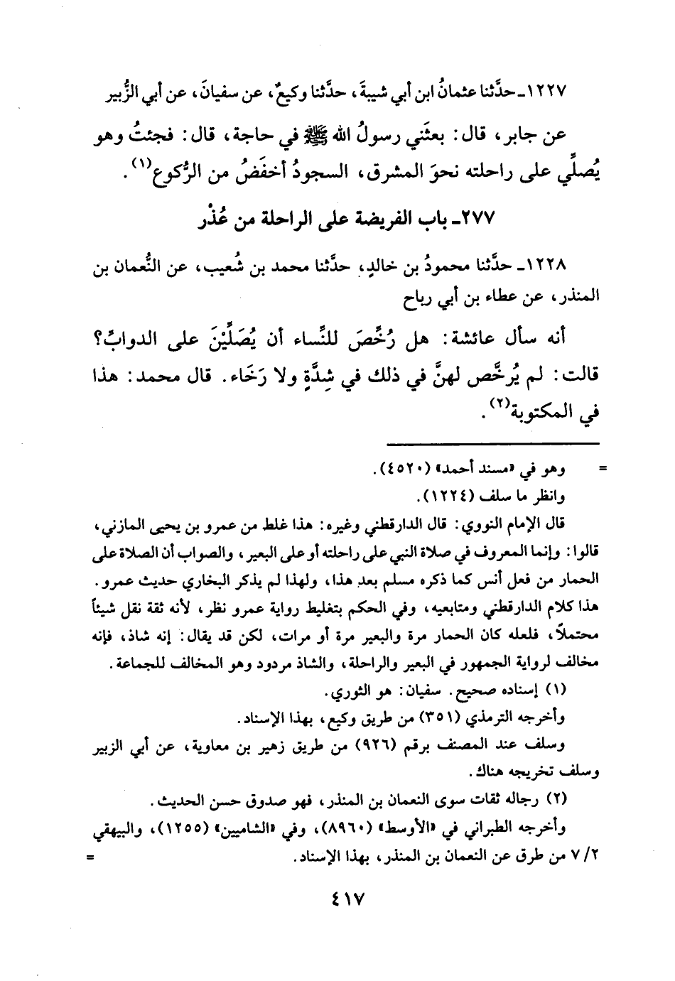 ١٢٢٧ - حدثنا عثمانُ ابن أبي شيبةَ، حدثنا وكيع، عن سفيانَ، عن أبي الزبير عن جابر، قال: بعثَني رسولُ الله - صلَّى الله عليه وسلم - في حاجة، قال: فجئتُ وهو يُصلّي على راحلته نحوَ المشرق، السجودُ أخفَضُ من الركوع (¬١).