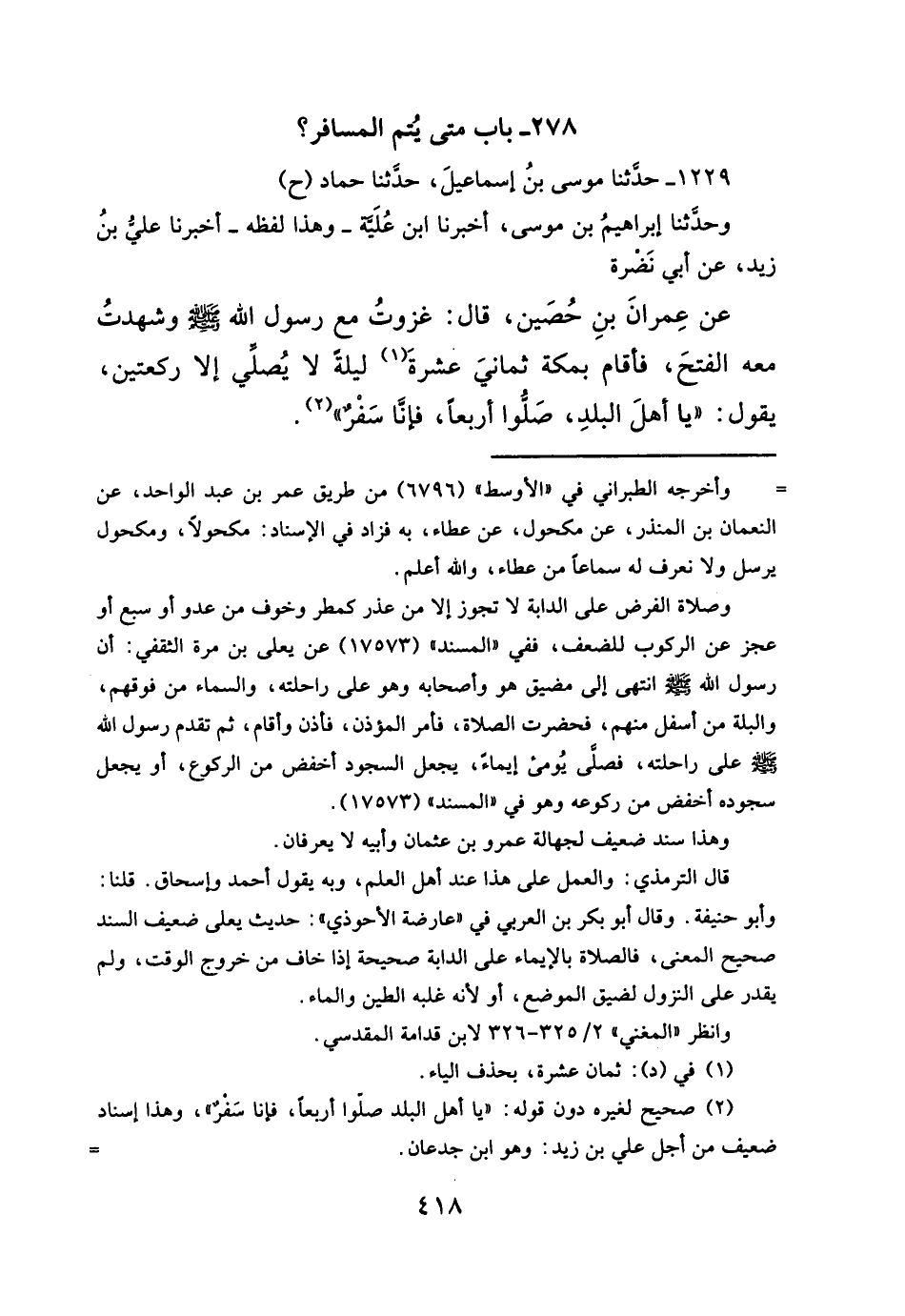 عن عِمرانَ بنِ حُصَين، قال: غزوتُ مع رسول الله - صلَّى الله عليه وسلم - وشهدتُ معه الفتحَ، فأقام بمكة ثمانيَ عشرةَ (¬١) ليلةً لا يُصلّي إلا ركعتين، يقول: "يا أهلَ البلدِ، صَلُّوا أربعاً، فإنا سَفْرٌ" (¬٢).