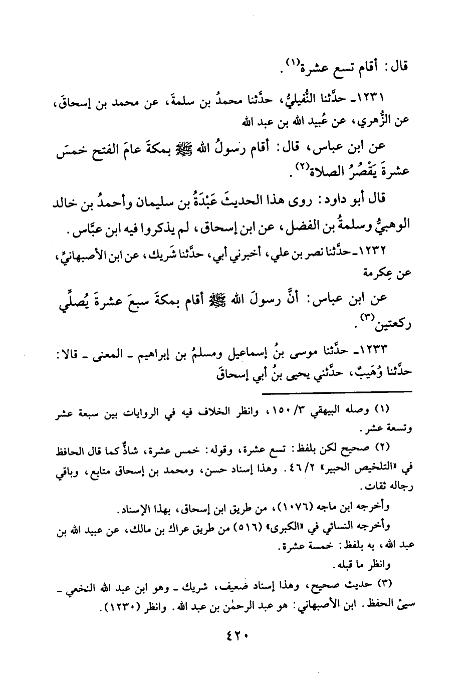 عن ابن عباس: أنَّ رسولَ الله - صلَّى الله عليه وسلم - أقام بمكةَ سبعَ عشرةَ يُصلّي ركعتين (¬٣).
