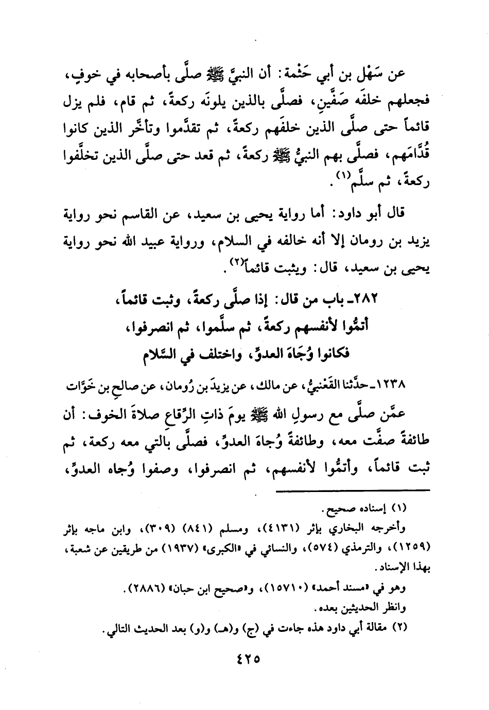 قال أبو داود: أما رواية يحيى بن سعيد، عن القاسم نحو رواية يزيد بن رومان إلا أنه خالفه في السلام، ورواية عبيد الله نحو رواية يحيى بن سعيد، قال: ويثبت قائماً (¬٢).