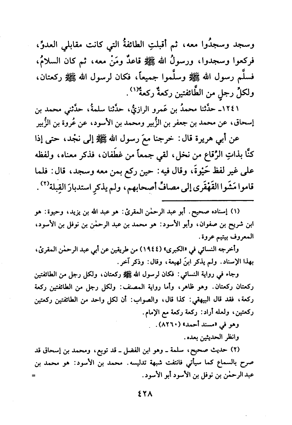 ١٢٤١ - حدثنا محمدُ بن عَمرو الرازيُ، حدثنا سلمةُ، حدثني محمد بن إسحاق، عن محمد بن جعفر بن الزبير ومحمد بن الأسود، عن عُروة بن الزبير عن أبي هريرة قال: خرجنا معَ رسول الله - صلَّى الله عليه وسلم - إلى نجْد، حتى إذا كنّا بذاتِ الرِّقاع من نخل، لقي جمعاً من غطَفان، فذكر معناه، ولفظه على غير لفظ حَيوةَ، وقال فيه: حين ركع بمن معه وسجد، قال: فلما قاموا مَشَوا القَهقَرى إلى مصافّ أصحابهم، ولم يذكرِ استدبارَ القِبلة (¬٢).