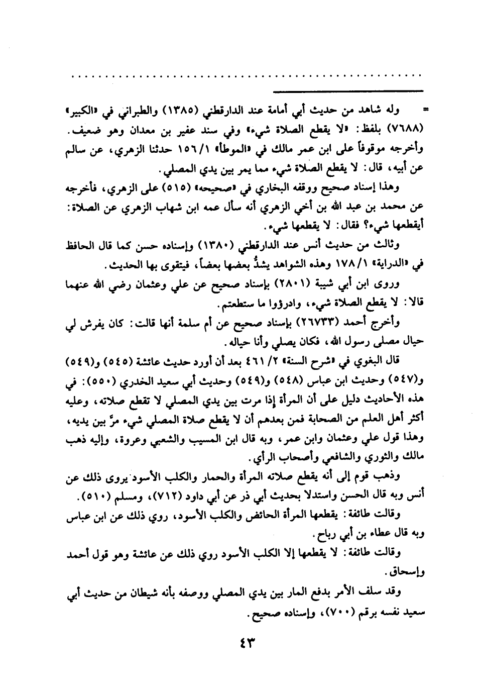 قال البغوي فى "شرح السنة" ٢/ ٤٦١ بعد أن أورد حديث عائشة (٥٤٥) و (٥٤٩) و (٥٤٧) وحديث ابن عباس (٥٤٨) و (٥٤٩) وحديث أبي سعيد الخدري (٥٥٠): في هذه الأحاديث دليل على أن المرأة إذا مرت بين يدي المصلى لا تقطع صلاته، وعليه أكثر أهل العلم من الصحابة فمن بعدهم أن لا يقطع صلاة المصلي شيء مرَّ بين يديه، وهذا قول على وعثمان وابن عمر، وبه قال ابن المسيب والشعبي وعروة، وإليه ذهب مالك والثورى والشافعي وأصحاب الرأي.