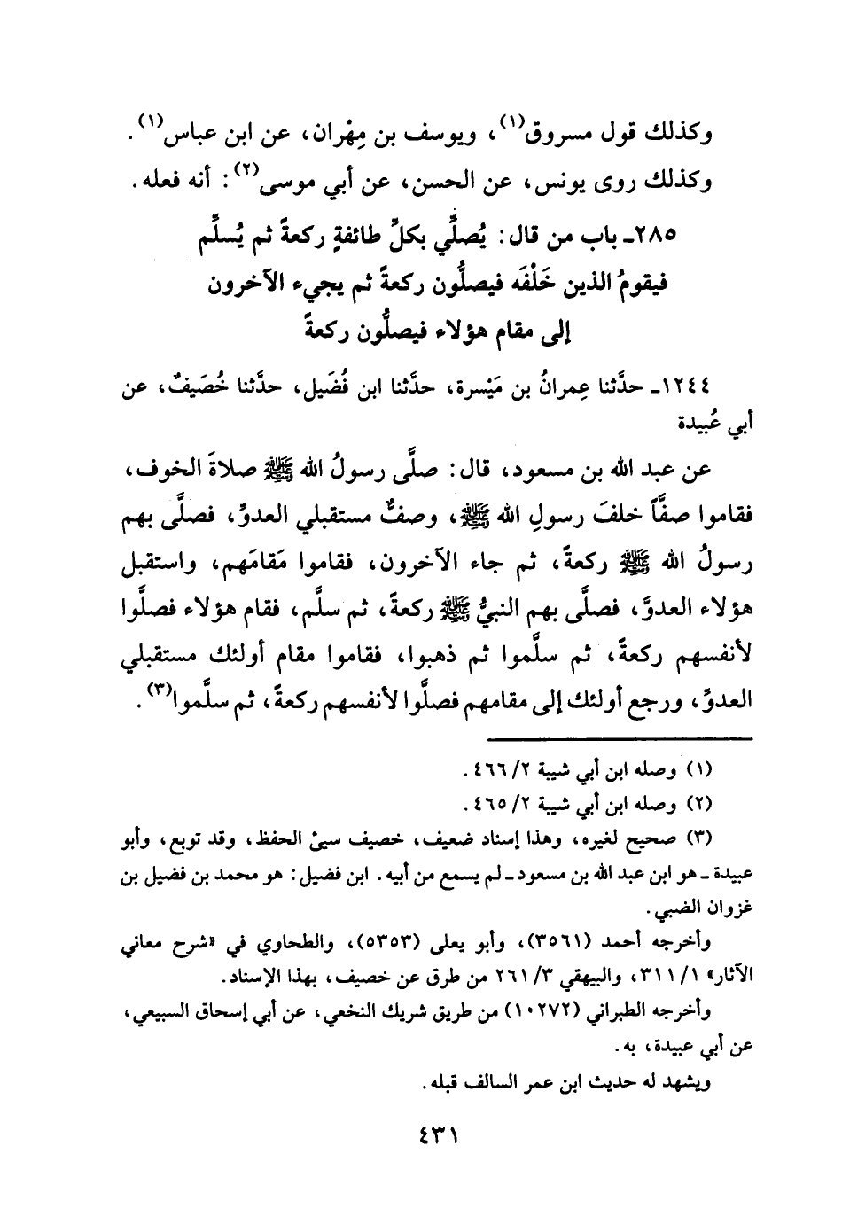 ٢٨٥ - باب من قال: يُصلي بكل طائفةِ ركعةَ ثم يُسلِّم فيقومُ الذين خَلفَه فيصلُّون ركعةَ ثم يجيء الآخرون إلى مقام هؤلاء فيصلون ركعةً