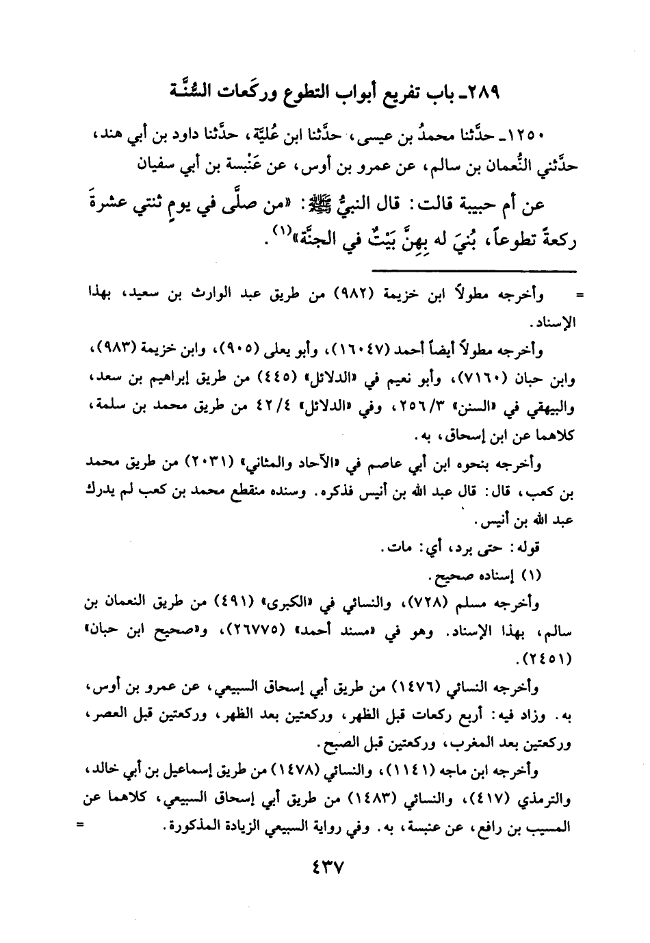 عن أم حبيبة قالت: قال النبيُّ - صلَّى الله عليه وسلم -: "من صلّى في يومٍ ثنتي عشرةَ ركعةً تطوعاً، بُنيَ له بِهِنَّ بَيْتٌ في الجنة" (¬١).