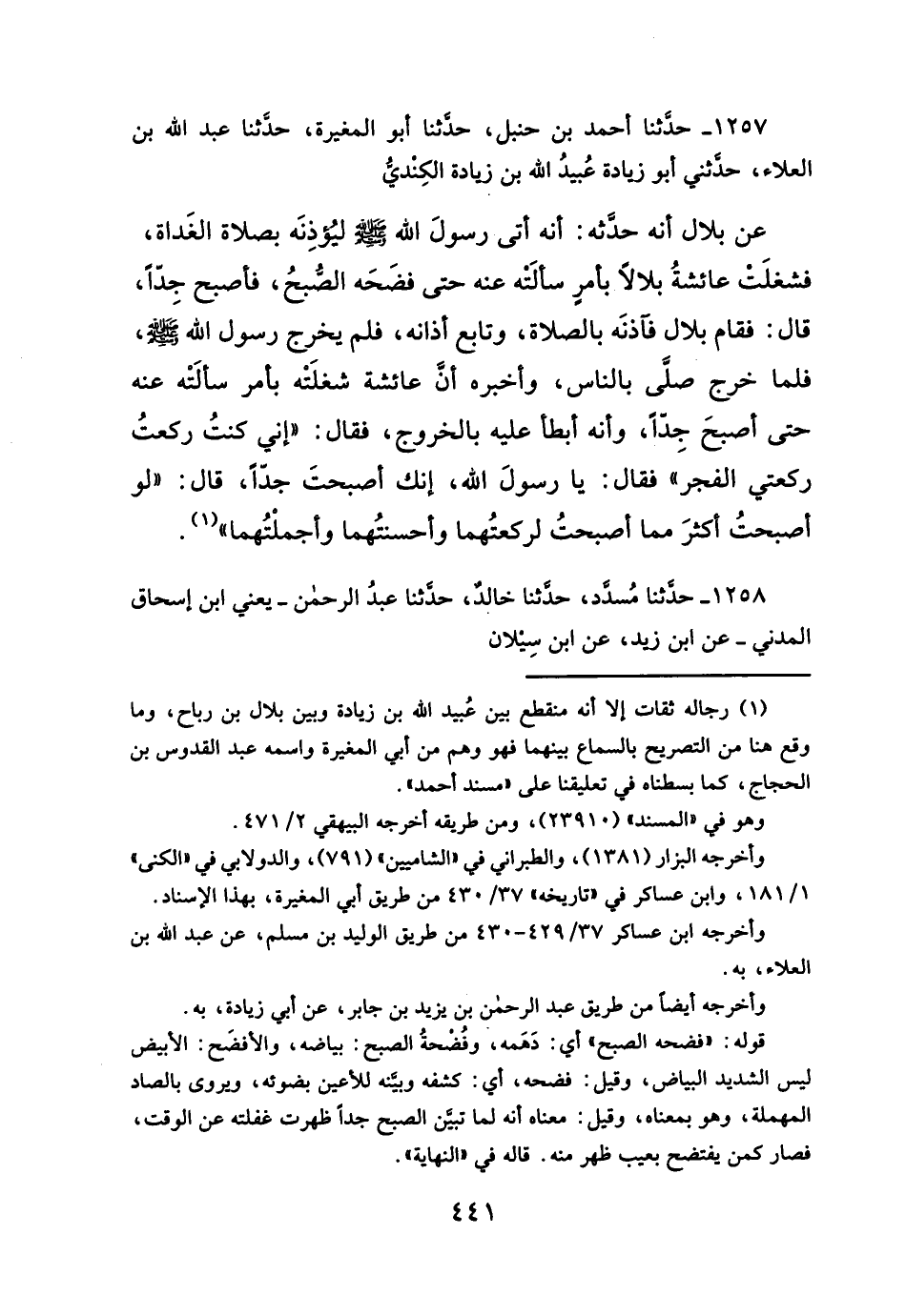 عن بلال أنه حدَّثه: أنه أتى رسولَ الله - صلَّى الله عليه وسلم - ليؤذِنَه بصلاة الغَداة، فشغلَت عائشةُ بلالاً بأمرٍ سألَته عنه حتى فضَحَه الصُبحُ، فأصبح جِدّاً، قال: فقام بلال َفآذنَه بالصلاة، وتابع أذانه، فلم يخرج رسول الله - صلَّى الله عليه وسلم -، فلما خرج صلَّى بالناس، وأخبره أن عائشة شغلَتْه بأمر سألَتْه عنه حتى أصبحَ جِداً، وأنه أبطأ عليه بالخروج، فقال: "إني كنتُ ركعتُ ركعتي الفجر" فقال: يا رسولَ الله، إنك أصبحتَ جدّاً، قال: "لو أصبحتُ أكثرَ مما أصبحتُ لركعتُهما وأحسنتُهما وأجملْتُهما" (¬١).