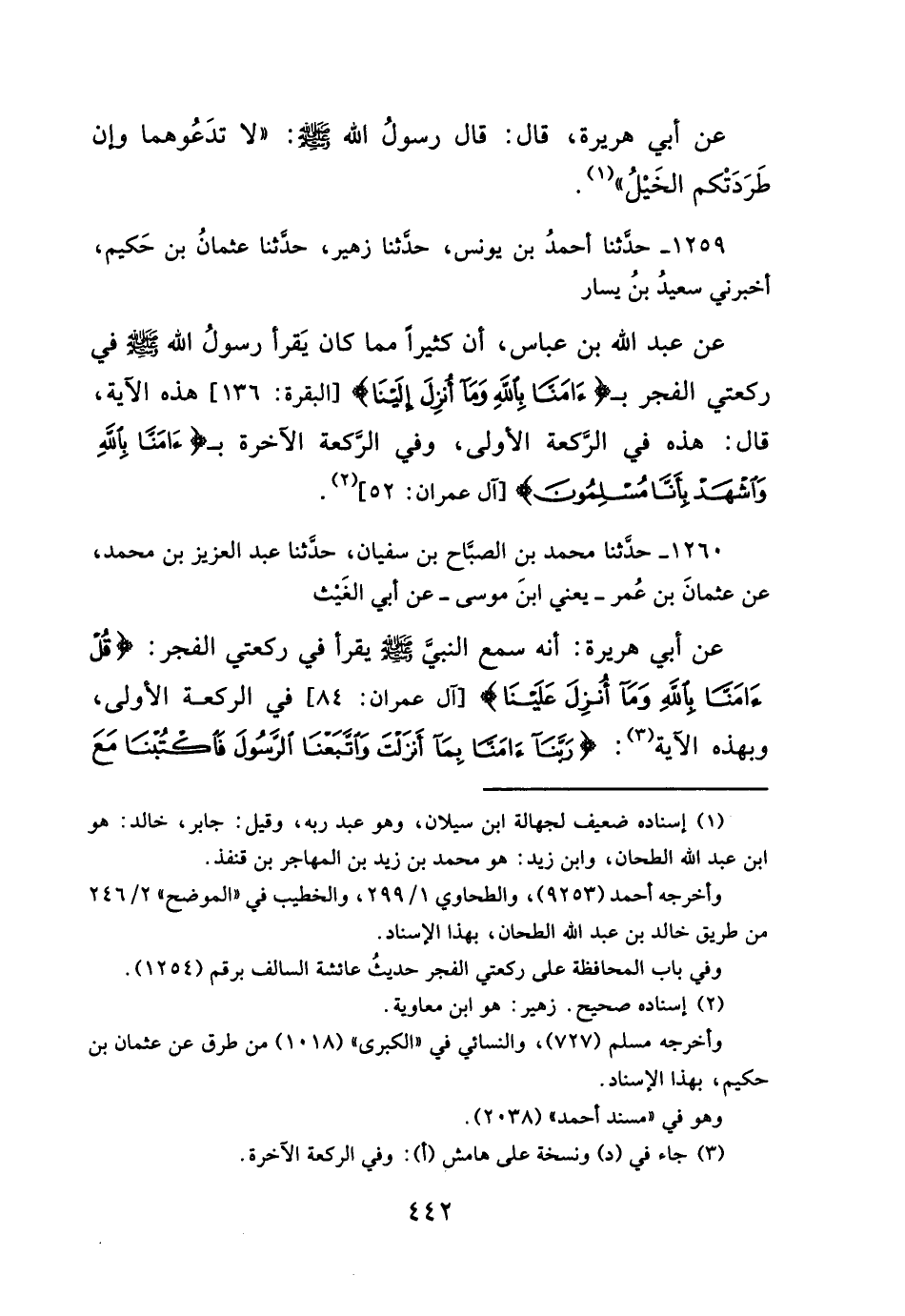 عن أبي هريرة: أنه سمع النبيَّ - صلَّى الله عليه وسلم - يقرأ في ركعتي الفجر: {قُلْ آمَنَّا بِاللَّهِ وَمَا أُنْزِلَ عَلَيْنَا} [آل عمران: ٨٤] في الركعة الأولى، وبهذه الآية (¬٣): {رَبَّنَا آمَنَّا بِمَا أَنْزَلْتَ وَاتَّبَعْنَا الرَّسُولَ فَاكْتُبْنَا مَعَ الشَّاهِدِينَ (٥٣)} [آل عمران: ٥٣]