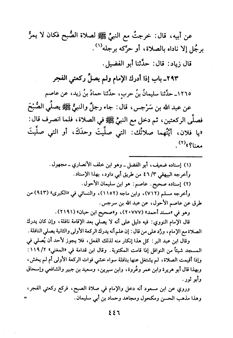 ١٢٦٥ - حدثنا سليمانُ بنُ حربِ، حدثنا حمادُ بنُ زيد، عن عاصم عن عبد الله بن سَرجس، قال: جاء رجل والنبيُّ - صلَّى الله عليه وسلم - يصلّي الصُبْحَ فصلَّى الركعتين، ثم دخل مع النبيَّ - صلَّى الله عليه وسلم - في الصلاة، فلما انصرف قال: