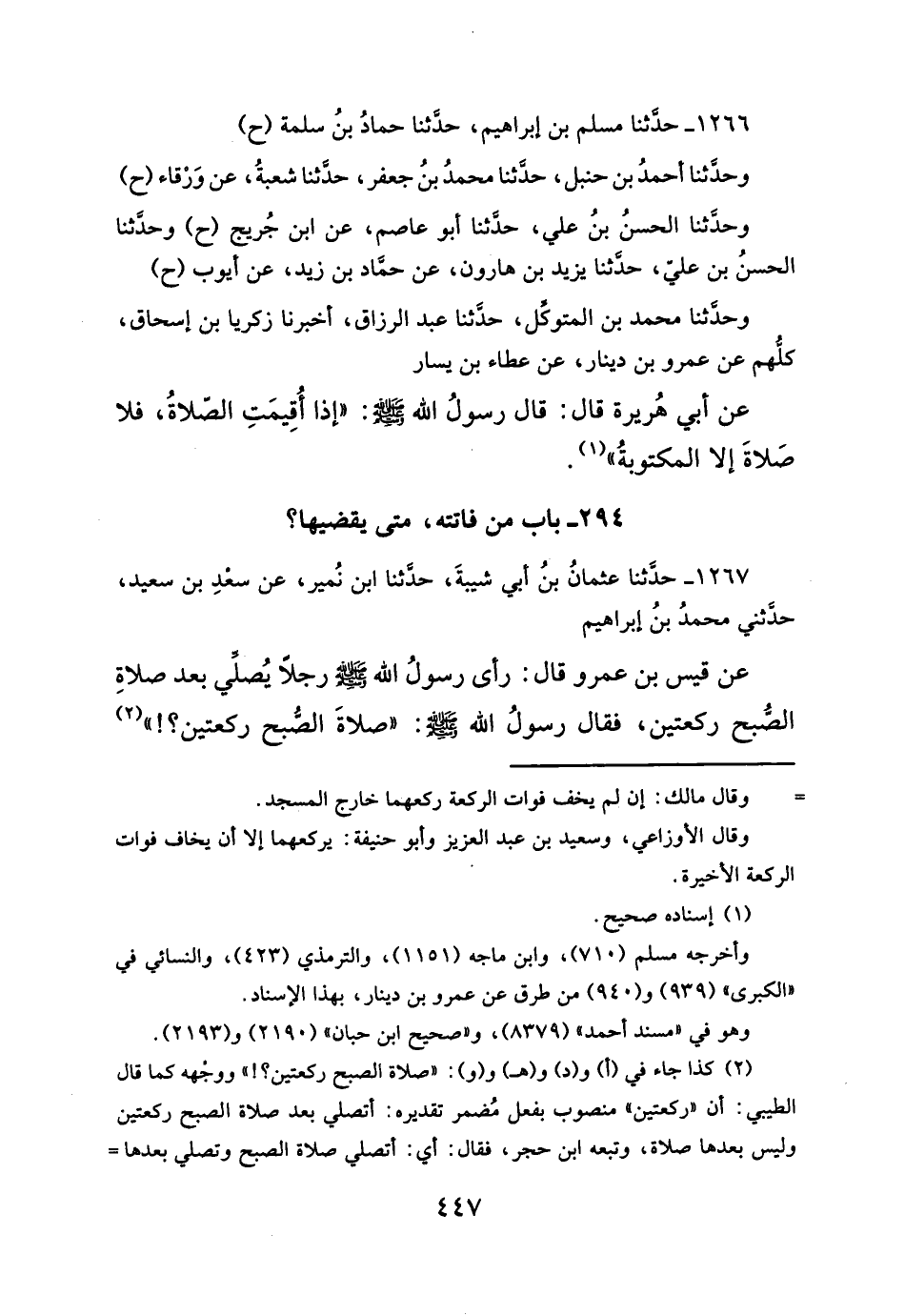 عن قيس بن عمرو قال: رأى رسولُ الله - صلَّى الله عليه وسلم - رجلاً يُصلّي بعد صلاةِ الصبح ركعتين، فقال رسولُ الله - صلَّى الله عليه وسلم -: "صلاةَ الصبح ركعتين؟! " (¬٢)