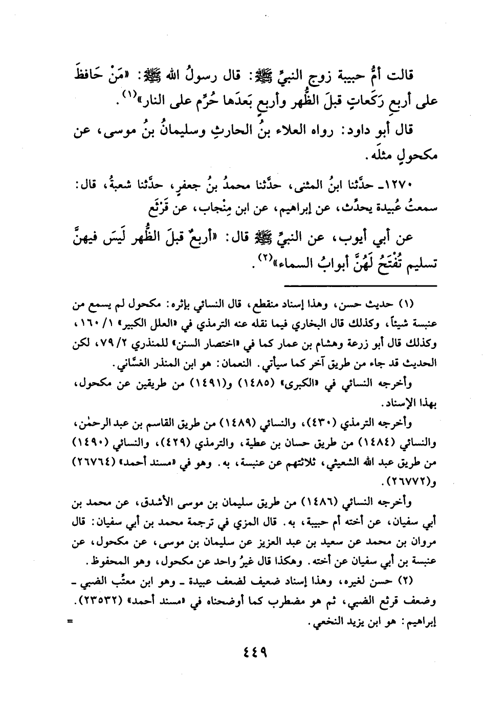 قالت أمُ حبيبة زوج النبيَّ - صلَّى الله عليه وسلم -: قال رسولُ الله - صلَّى الله عليه وسلم -: "مَنْ حَافظَ على أربعِ رَكَعاتِ قبلَ الظهر وأربعٍ بَعدَها حُرِّم على النار" (¬١). قال أبو داود: رواه العلاء بنُ الحارثِ وسليمانُ بنُ موسى، عن مكحولٍ مثلَه.