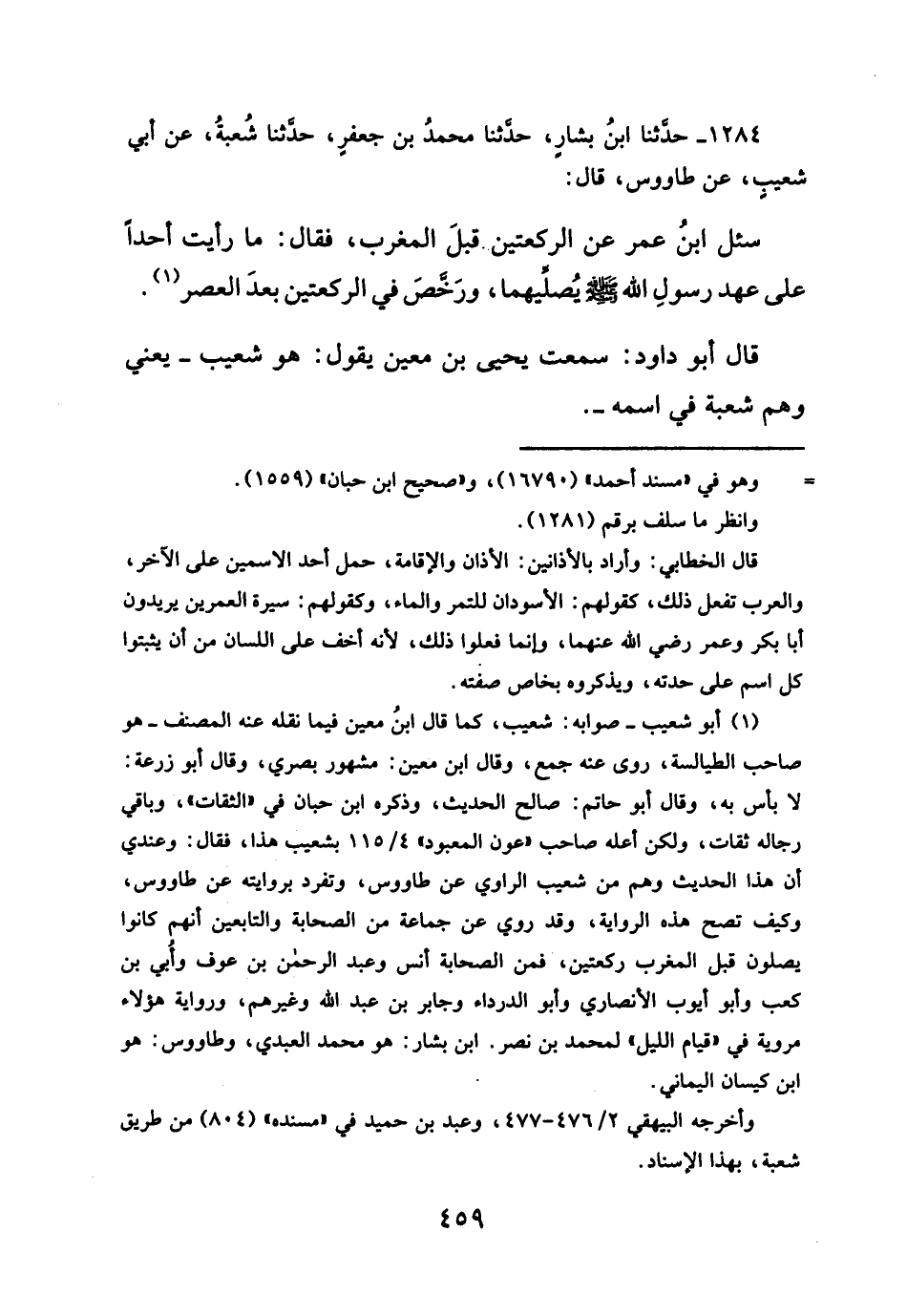 (¬١) أبو شعيب - صوابه: شعيب، كما قال ابنُ معين فيما نقله عنه المصنف - هو صاحب الطيالسة، روى عنه جمع، وقال ابن معين: مشهور بصرى، وقال أبو زرعة: لا بأس به، وقال أبو حاتم: صالح الحديث، وذكره ابن حبان في "الثقات"، وباقي رجاله ثقات، ولكن أعله صاحب "عون المعبود" ٤/ ١١٥ بشعيب هذا، فقال: وعندي أن هذا الحديث وهم من شعيب الراوي عن طاووس، وتفرد بروايته عن طاووس، وكيف تصح هذه الرواية، وقد روي عن جماعة من الصحابة والتابعين أنهم كانوا يصلون قبل المغرب ركعتين، فمن الصحابة أنس وعبد الرحمن بن عوف وأُبي بن كعب وأبو أيوب الأنصاري وأبو الدرداء وجابر بن عبد الله وغيرهم، ورواية هؤلاء مروية في "قيام الليل" لمحمد بن نصر. ابن بشار: هو محمد العبدي، وطاووس: هو ابن كيسان اليماني.