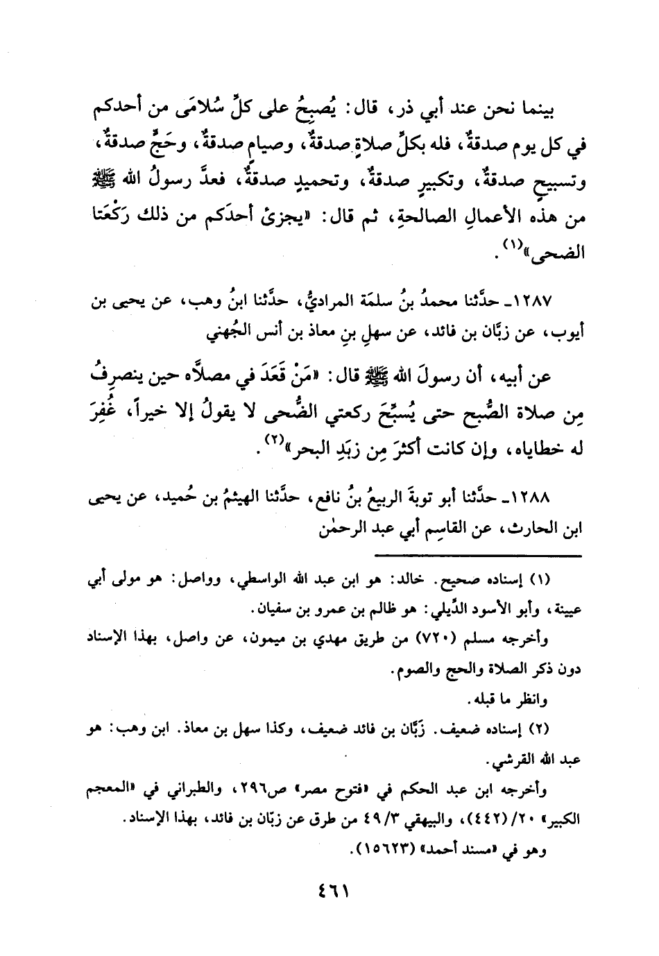 بينما نحن عند أبي ذر، قال: يُصبِحُ على كل سُلامَى من أحدكم في كل يوم صدقةٌ، فله بكل صلاةٍ صدقةٌ، وصيامٍ صدقةٌ، وحَج صدقةٌ، وتسبيحٍ صدقةٌ، وتكبيرٍ صدقةٌ، وتحميدٍ صدقةٌ، فعدَّ رسولُ الله - صلَّى الله عليه وسلم - من هذه الأعمالِ الصالحةِ، ثم قال: "يجزئ أحدَكم من ذلك رَكعَتا الضحى" (¬١).
