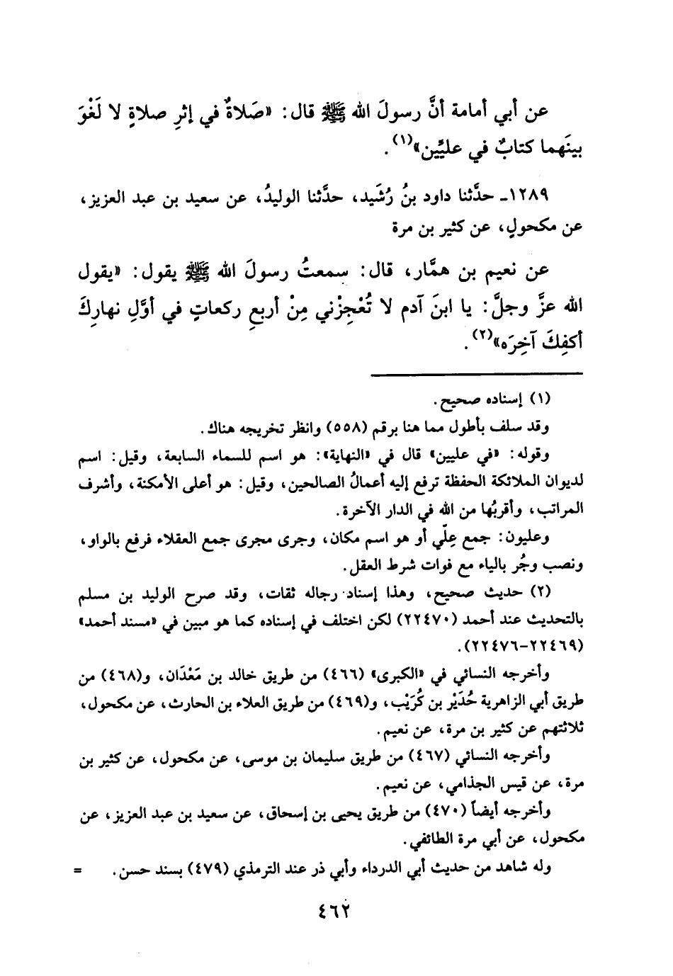عن نعيم بن همّار، قال: سمعتُ رسولَ الله - صلَّى الله عليه وسلم - يقول: "يقول الله عز وجل: يا ابنَ آدم لا تُعجِزني مِن أربعِ ركعاتِ في أولِ نهارِكَ أكفِكَ آخِرَه" (¬٢).