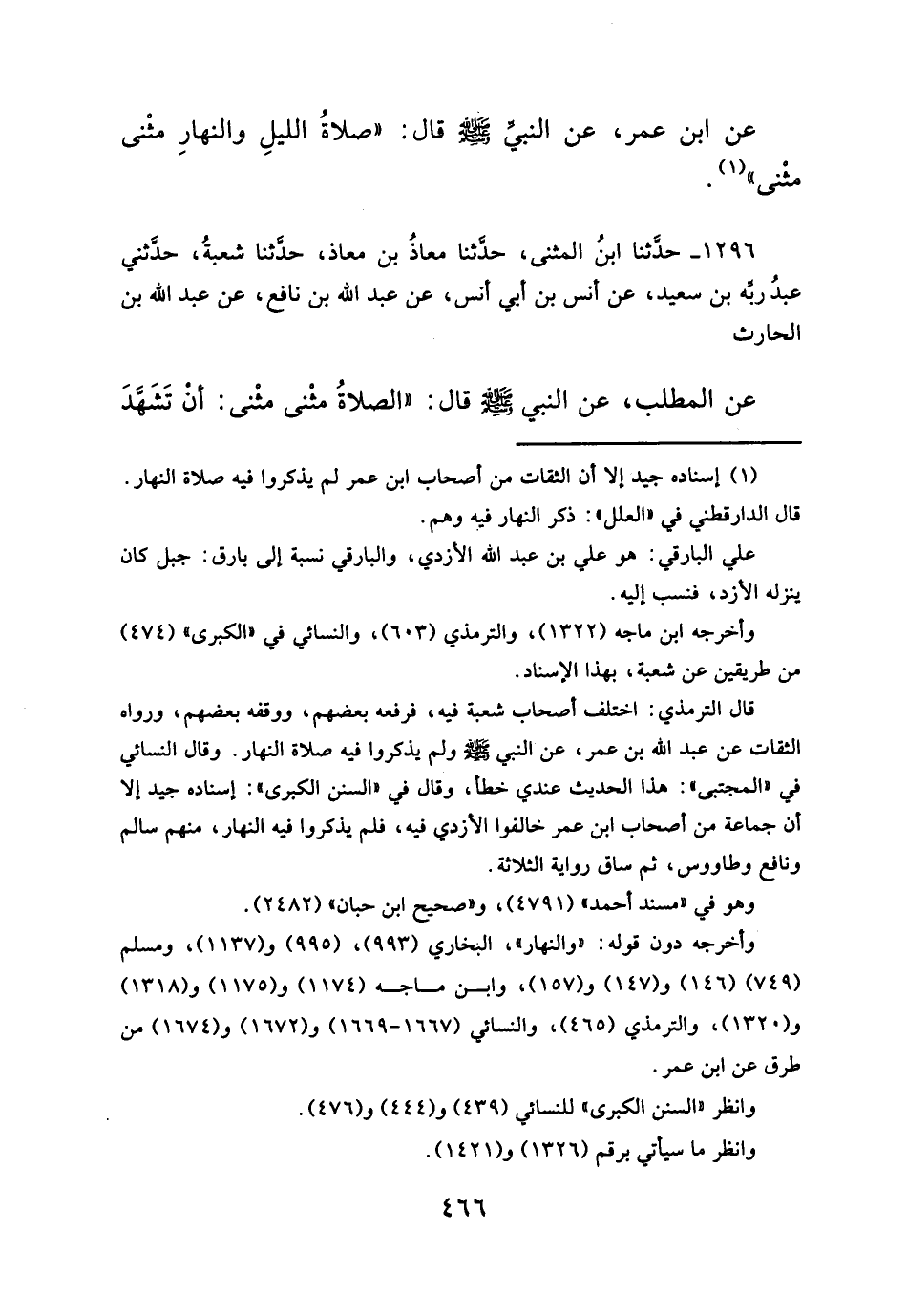 عن ابن عمر، عن النبيَّ - صلَّى الله عليه وسلم - قال: "صلاةُ الليلِ والنهارِ مثنى مثْنى" (¬١).