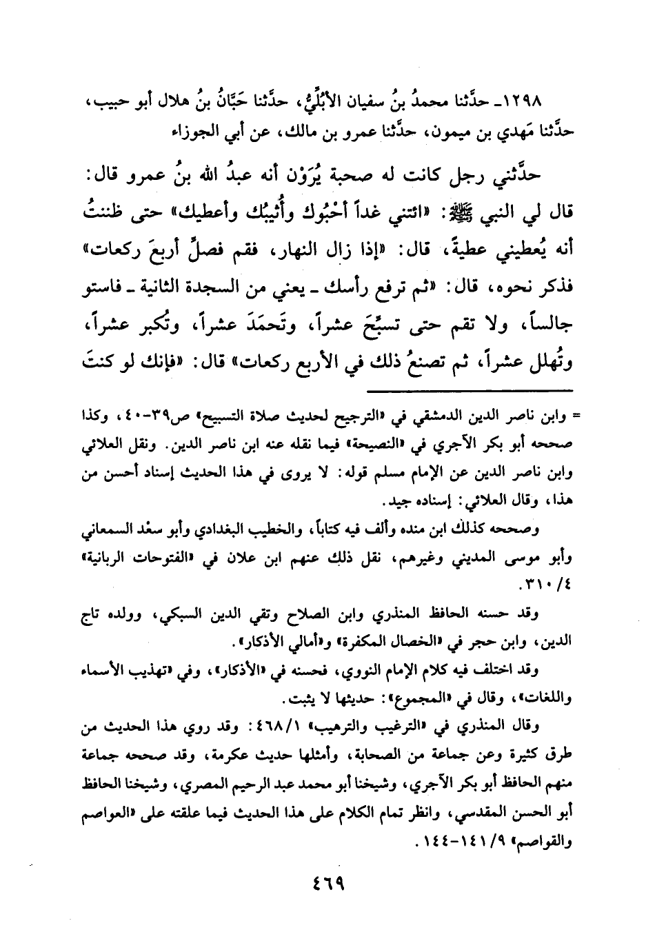 حدثني رجل كانت له صحبة يُرَوْن أنه عبدُ الله بنُ عمرو قال: قال لي النبي - صلَّى الله عليه وسلم -: "ائتني غداً أحْبُوك وأُثيبُك وأعطيك" حتى ظننتُ أنه يُعطيني عطيةً، قال: "إذا زال النهار، فقم فصل أربعَ ركعات" فذكر نحوه، قال: "ثم ترفع رأسك - يعني من السجدة الثانية - فاستو جالساً، ولا تقم حتى تسبِّحَ عشراً، وتَحمَدَ عشراً، وتكبر عشراَ، وتُهلل عشراً، ثم تصنعُ ذلك في الأربع ركعات" قال: "فإنك لو كنتَ