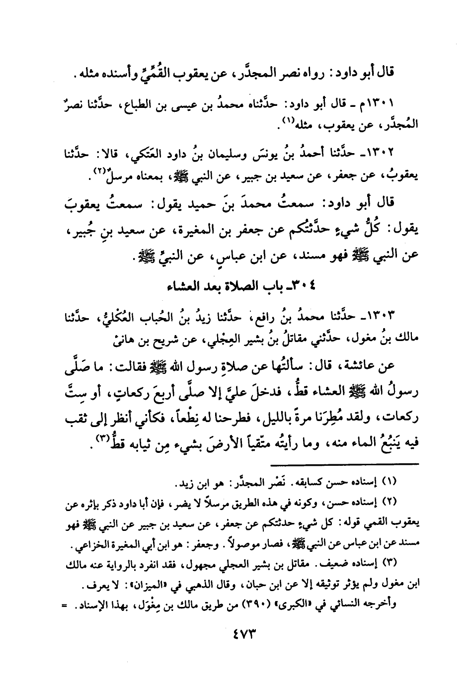 ١٣٠١ م - قال أبو داود: حدثناه محمدُ بن عيسى بن الطباع، حدثنا نصر المُجدر، عن يعقوب، مثله (¬١).