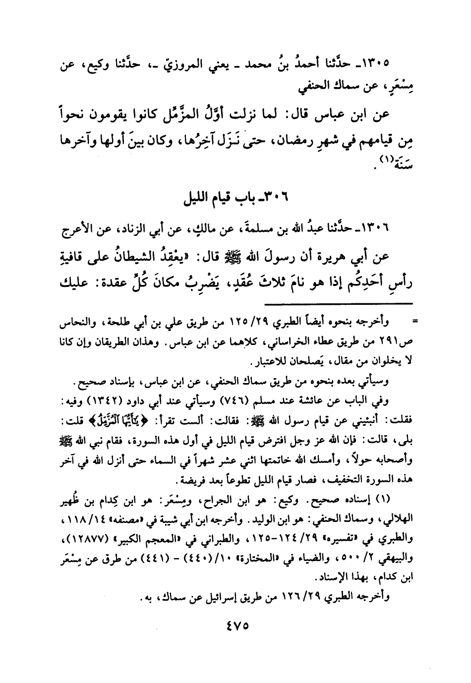 ١٣٠٦ - حدثنا عبدُ الله بن مسلمةَ، عن مالكِ، عن أبي الزناد، عن الأعرج عن أبي هريرة أن رسولَ الله - صلَّى الله عليه وسلم - قال: "يعقِدُ الشيطانُ على قافيةِ رأسِ أحَدِكُم إذا هو نامَ ثلاثَ عُقَد، يَضْرِبُ مكانَ كُل عقدة: عليك