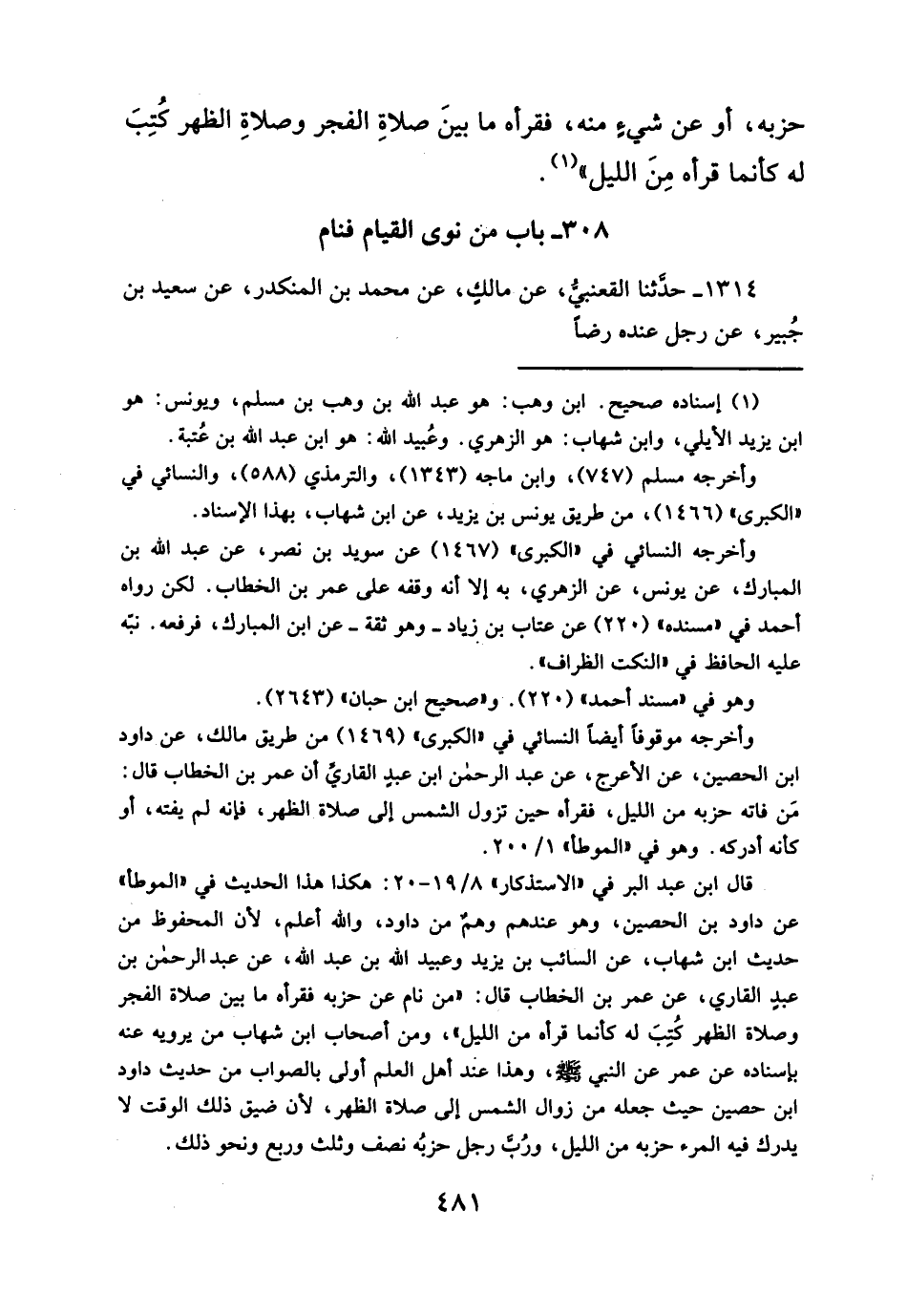 قال ابن عبد البر في"الاستذكار" ٨/ ١٩ - ٢٠: هكذا هذا الحديث في "الموطأ" عن داود بن الحصين، وهو عندهم وهم من داود، والله أعلم، لأن المحفوظ من حديث ابن شهاب، عن السائب بن يزيد وعبيد الله بن عبد الله، عن عبدالرحمن بن عبدٍ القاري، عن عمر بن الخطاب قال: "من نام عن حزبه فقرأه ما بين صلاة الفجر وصلاة الظهر كتِبَ له كأنما قرأه من الليل"، ومن أصحاب ابن شهاب من يرويه عنه بإسناده عن عمر عن النبي - صلَّى الله عليه وسلم -، وهذا عند أهل العلم أولى بالصواب من حديث داود ابن حصين حيث جعله من زوال الشمس إلى صلاة الظهر، لأن ضيق ذلك الوقت لا يدرك فيه المرء حزبه من الليل، ورُبَّ رجل حزبُه نصف وثلث وربع ونحو ذلك.