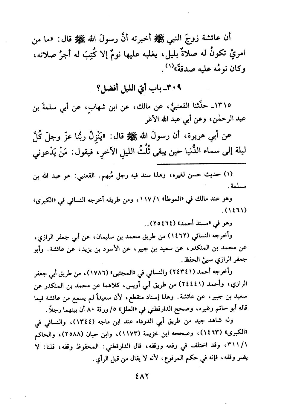 ١٣١٥ - حدَّثنا القعنبيُّ، عن مالك، عن ابن شهابٍ، عن أبي سلمةَ بن عبد الرحمن، وعن أبي عبد الله الأغر عن أبي هريرة، أن رسولَ الله - صلَّى الله عليه وسلم - قال: "يَنزِلُ ربنا عز وجلّ كُلَّ ليلة إلى سماء الدُنيا حين يبقى ثُلُثُ الليلِ الآخرِ، فيقول: مَنْ يَدْعوني