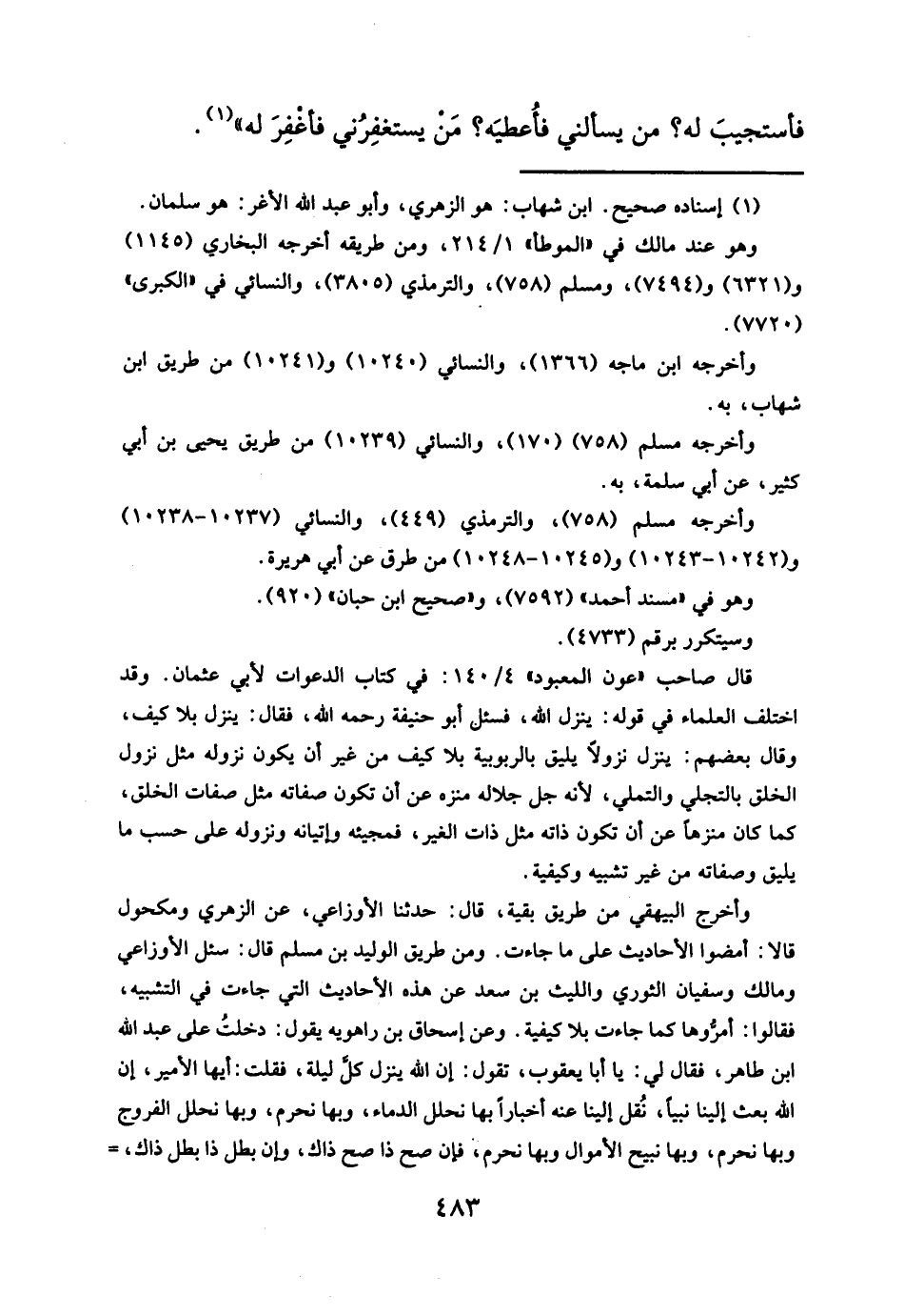 وأخرج البيهقي من طريق بقية، قال: حدَّثنا الأوزاعي، عن الزهري ومكحول قالا: أمضوا الأحاديث على ما جاءت. ومن طريق الوليد بن مسلم قال: سئل الأوزاعي ومالك وسفيان الثوري والليث بن سعد عن هذه الأحاديث التى جاءت في التشبيه، فقالوا: أمروها كما جاءت بلا كيفية. وعن إسحاق بن راهويه يقول: دخلتُ على عبد الله ابن طاهر، فقال لي: يا أبا يعقوب، تقول: إن الله ينزل كلَّ ليلة، فقلت: أيها الأمير، إن الله بعث إلينا نبيا، نُقل إلينا عنه أخباراً بها نحلل الدماء، وبها نحرم، وبها نحلل الفروج وبها نحرم، وبها نبيح الأموال وبها نحرم ,فإن صح ذا صح ذاك، وإن بطل ذا بطل ذاك،=