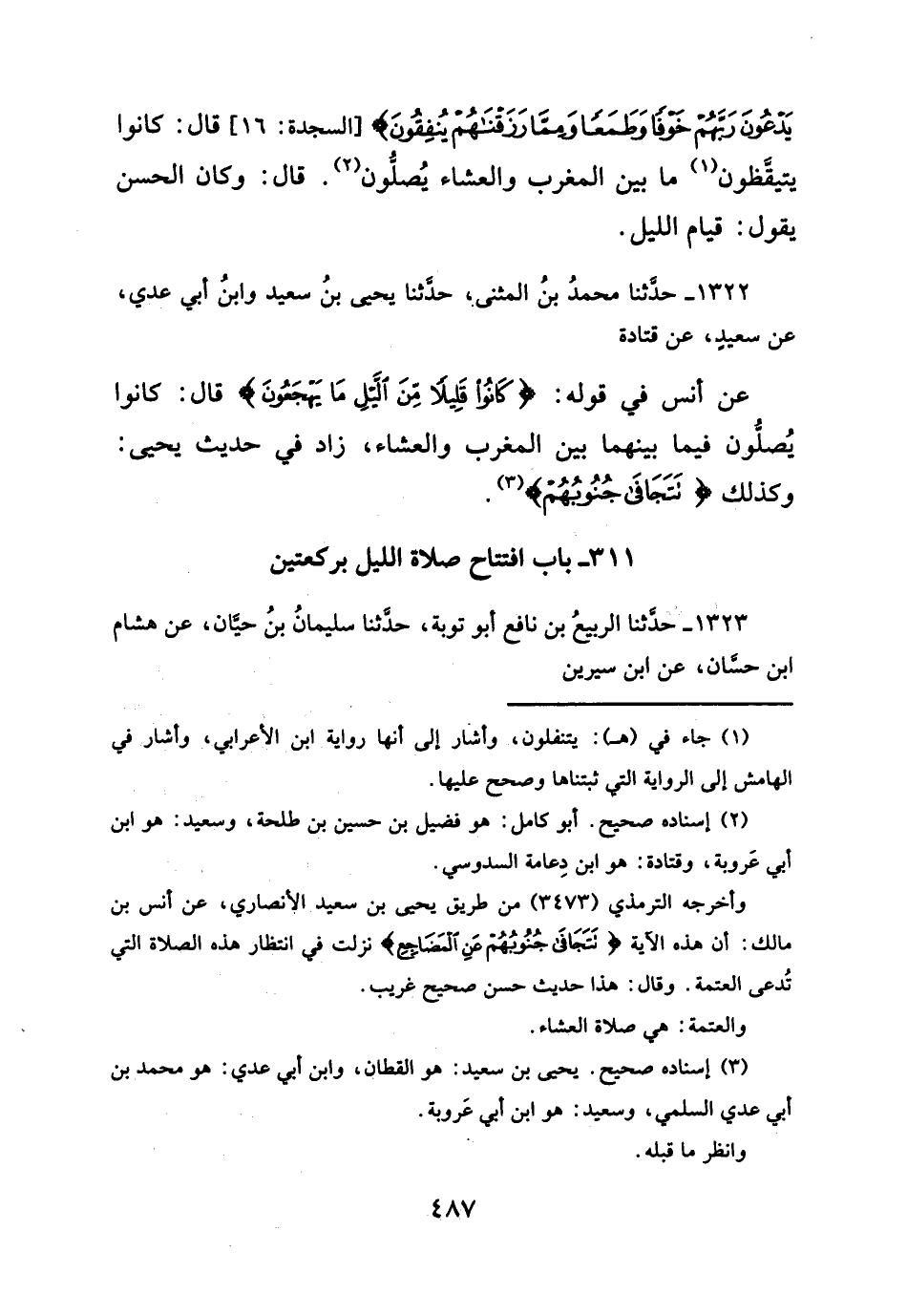 وأخرجه الترمذي (٣٤٧٣) من طريق يحيي بن سعيد الأنصاري، عن أنس بن مالك: أن هذه الأية {تَتَجَافَى جُنُوبُهُمْ عَنِ الْمَضَاجِعِ} نزلت في انتظار هذه الصلاة التي تُدعى العتمة. وقال: هذا حديث حسن صحيح غريب.