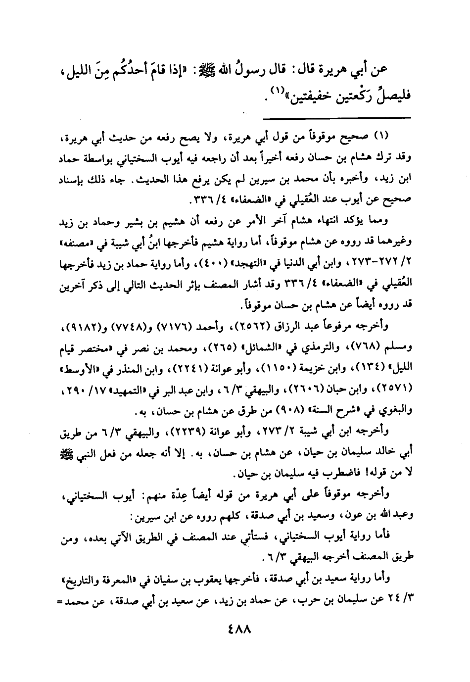 ومما يؤكد انتهاء هشام آخر الأمر عن رفعه أن هشيم بن بشير وحماد بن زيد وغيرهما قد رووه عن هشام موقوفاً، أما رواية هشيم فأخرجها ابنُ أبي شيبة في "مصنفه" ٢/ ٢٧٢ - ٢٧٣، وابن أبي الدنيا في "التهجد" (٤٠٠)، وأما رواية حماد بن زيد فأخرجها العُقيلي في "الضعفاء" ٤/ ٣٣٦ وقد أشار المصنف بإثر الحديث التالي إلى ذكر آخرين قد رووه أيضاً عن هشام بن حسان موقوفاً.