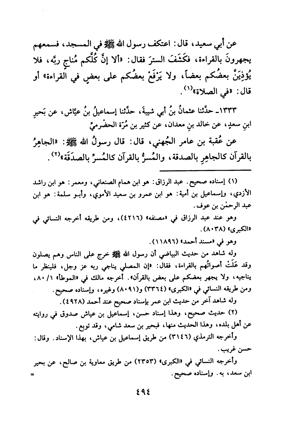 ١٣٣٣ - حدَّثنا عثمانُ بنُ أبي شيبةَ، حدَّثنا إسماعيلُ بنُ عيَّاش، عن بَحيرِ ابنِ سعدٍ، عن خالد بنِ معدان، عن كثير بن مُرّة الحضرميَّ